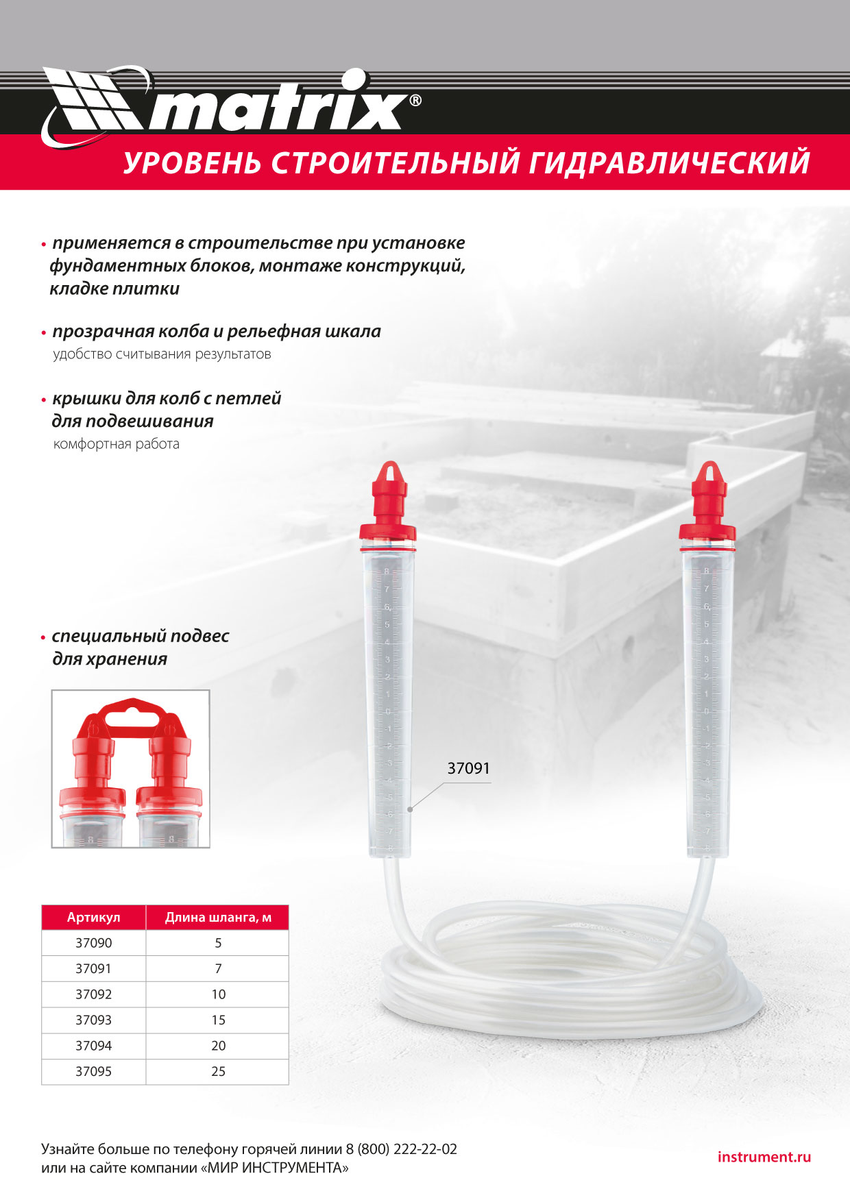 Гидроуровень Matrix 37093 с удлиненными колбами и рельефной градуировкой предназначен для выравнивания объектов на расстоянии до 15 м. Используется при проведении ремонтно-строительных работ: изготовлении опалубки, установке фундамента, кладке плитки. Особо светлые колбы с рельефной градуировкой облегчают считывание результатов измерения.