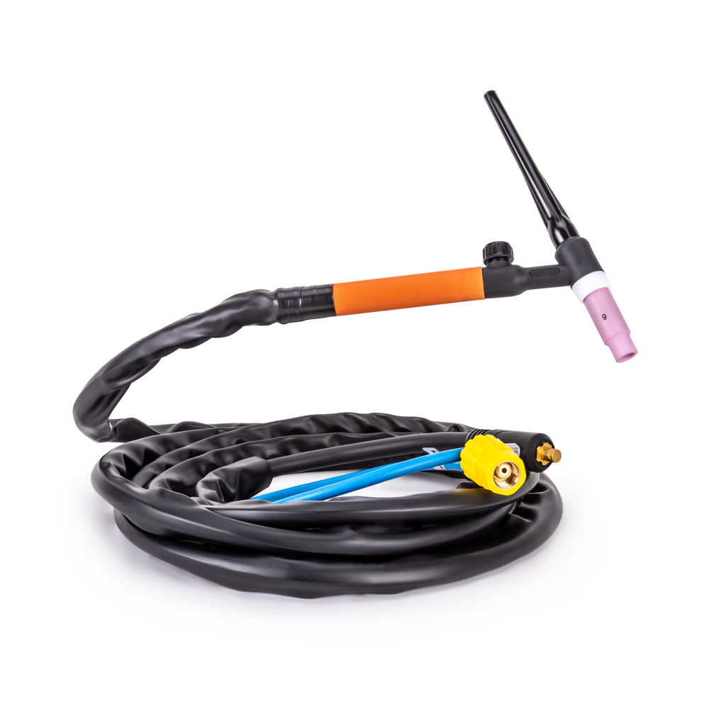 Сварочная горелка SRT-17V 4м предназначена для аргонодуговой сварки вольфрамовыми электродами при выполнении различных видов сварочных работ. Удобная эргономичная прорезиненная рукоятка горелки хорошо лежит в руке, что добавляет удобства во время сварочного процесса. С помощью вентиля на горелке можно регулировать подачу защитного газа во время сварки.ЭРГОНОМИЧНОСТЬ: Эргономичная прорезиненная рукоятка горелки хорошо лежит в руке, что добавляет удобства во время сварочного процесса.ПРЕИМУЩЕСТВА:Надёжный поджиг сварочной дугиВоздушное охлаждениеГибкий рукавКОМПЛЕКТАЦИЯ: Аргонодуговая горелка SRT-17V 4м - 1 шт.; Вольфрамовый электрод WT-20 (красный) Ø 1.6 мм - 1 шт.; Вольфрамовый электрод WT-20 (красный) Ø 2.4 мм - 1 шт.; Цанга Ø 1.6 мм 10N23 (аналог Abicor Binzel 702.0008) - 1 шт.; Цанга Ø 2.4 мм 10N24 (аналог Abicor Binzel 702.0009) - 1 шт.; Корпус цанги Ø 1.6 мм 10N31 (аналог Abicor Binzel 701.0191) – 1 шт.; Корпус цанги Ø 2.4 мм 10N32 (аналог Abicor Binzel 701.0196) – 1 шт.; Сопло керамическое №5 10N49 (аналог Abicor Binzel 701.0108) - 1 шт.; Сопло керамическое №6 10N48 (аналог Abicor Binzel 701.0109) – 1 шт.; Колпачок длинный 57Y02 (аналог Abicor Binzel 712.1051) - 1шт.; Колпачок короткий 57Y04  (аналог Abicor Binzel 712.1053) – 1 шт.*Производитель оставляет за собой право менять комплектацию аппарата.