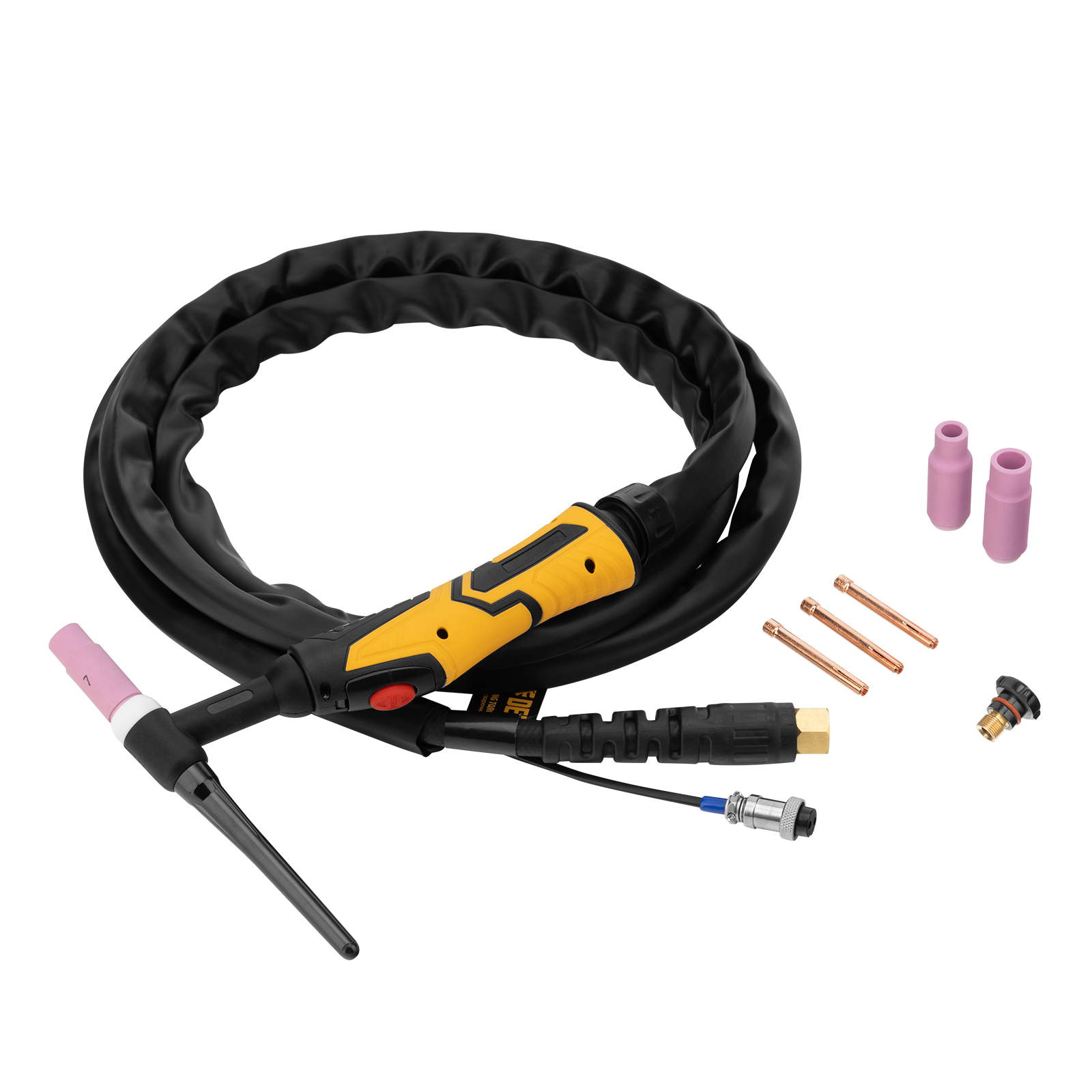 Сварочная горелка Denzel TIG WP26 93644 с рукавом длиной 3 м и управляющим разъемом на 2 пина используется для аргонодуговой сварки неплавящимся электродом диаметром 1-4 мм. Максимальная величина постоянного сварочного тока составляет 180 A, переменного — 150 A. Горелка подходит для работы со сталями и цветными металлами, в т.ч. алюминием.