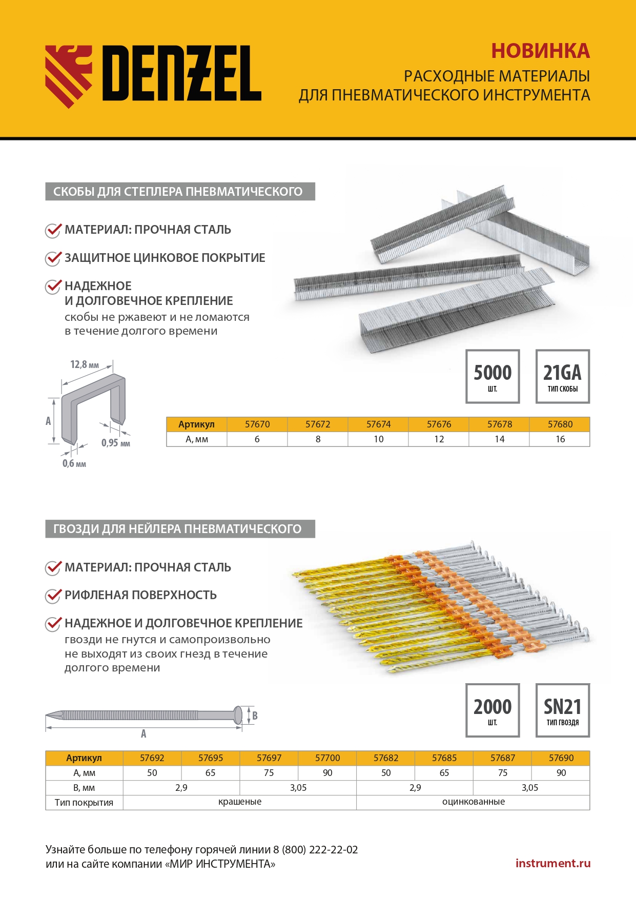 Гвозди Denzel 57700 типа SN21, длиной 90 мм и диаметром 3,05 мм, с крашеной поверхностью, 2000 шт. в упаковке, — расходники для пневматического нейлера. Используются для скрепления различных материалов, будут полезны во время сборочных и отделочных работ.