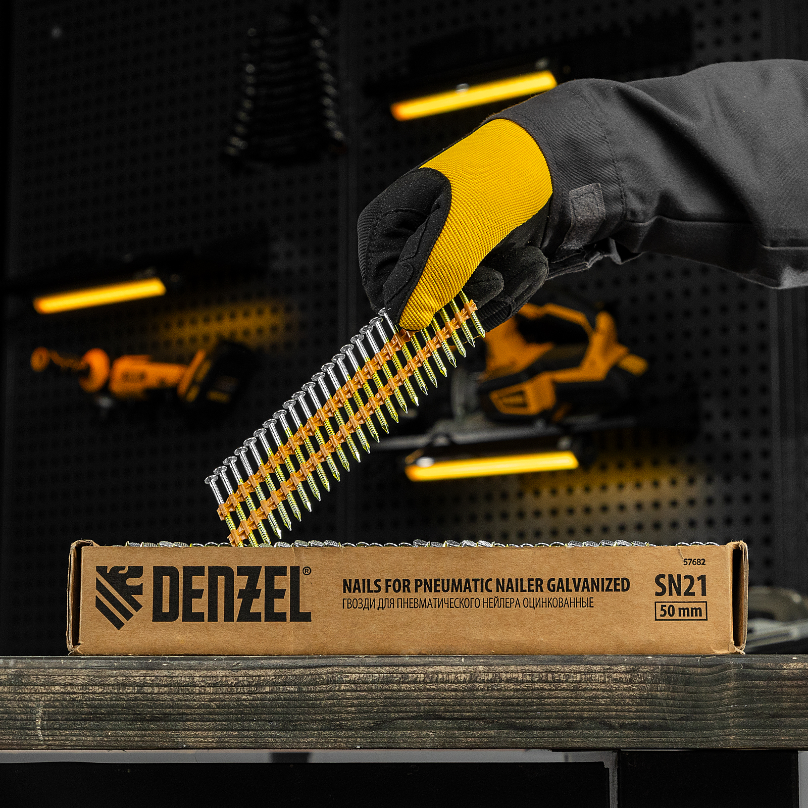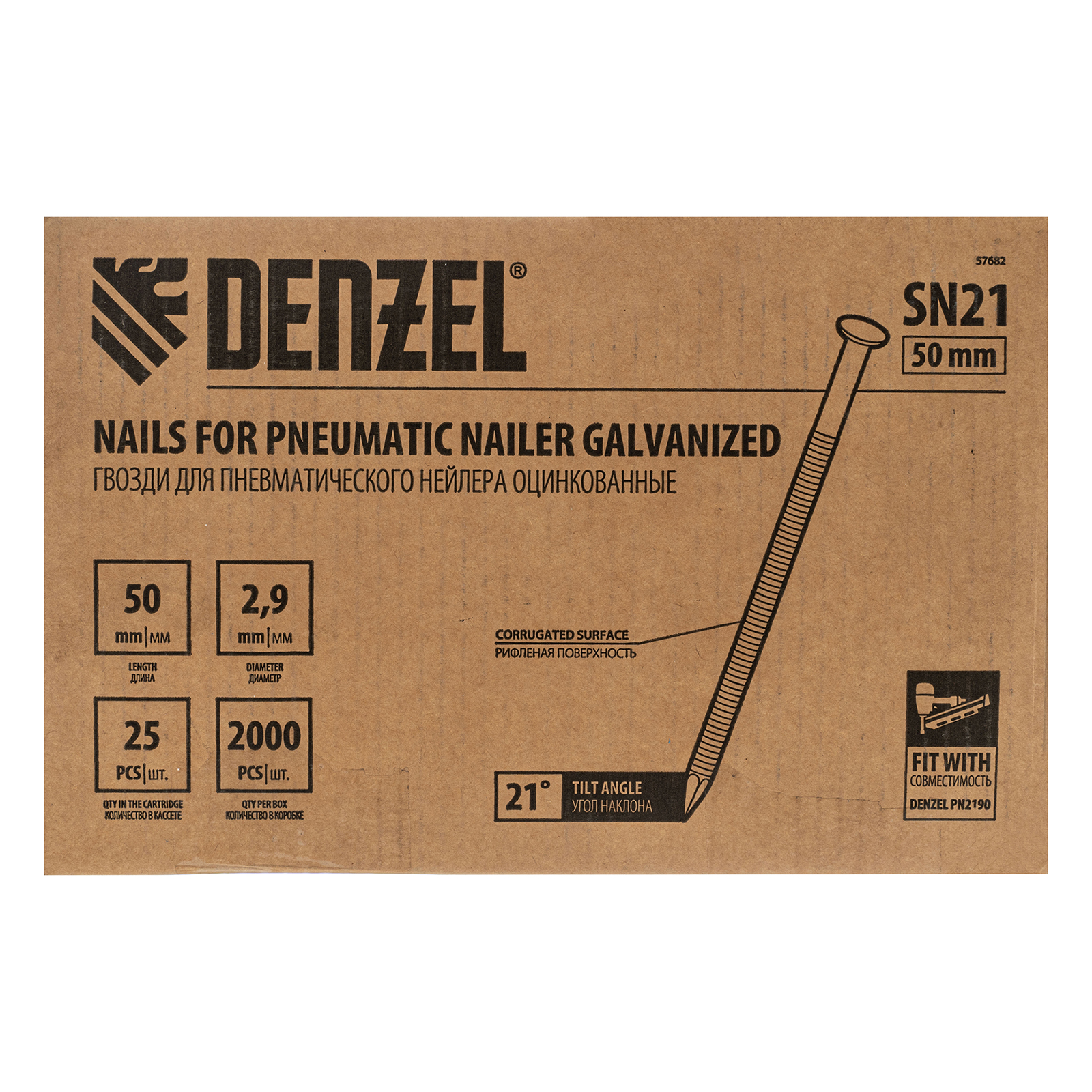 Оцинкованные гвозди Denzel 57682 типа SN21, длиной 50 мм и диаметром 2,9 мм, 2000 шт. в упаковке, — расходники для пневматического нейлера. Используются для скрепления различных материалов, будут полезны во время сборочных и отделочных работ.