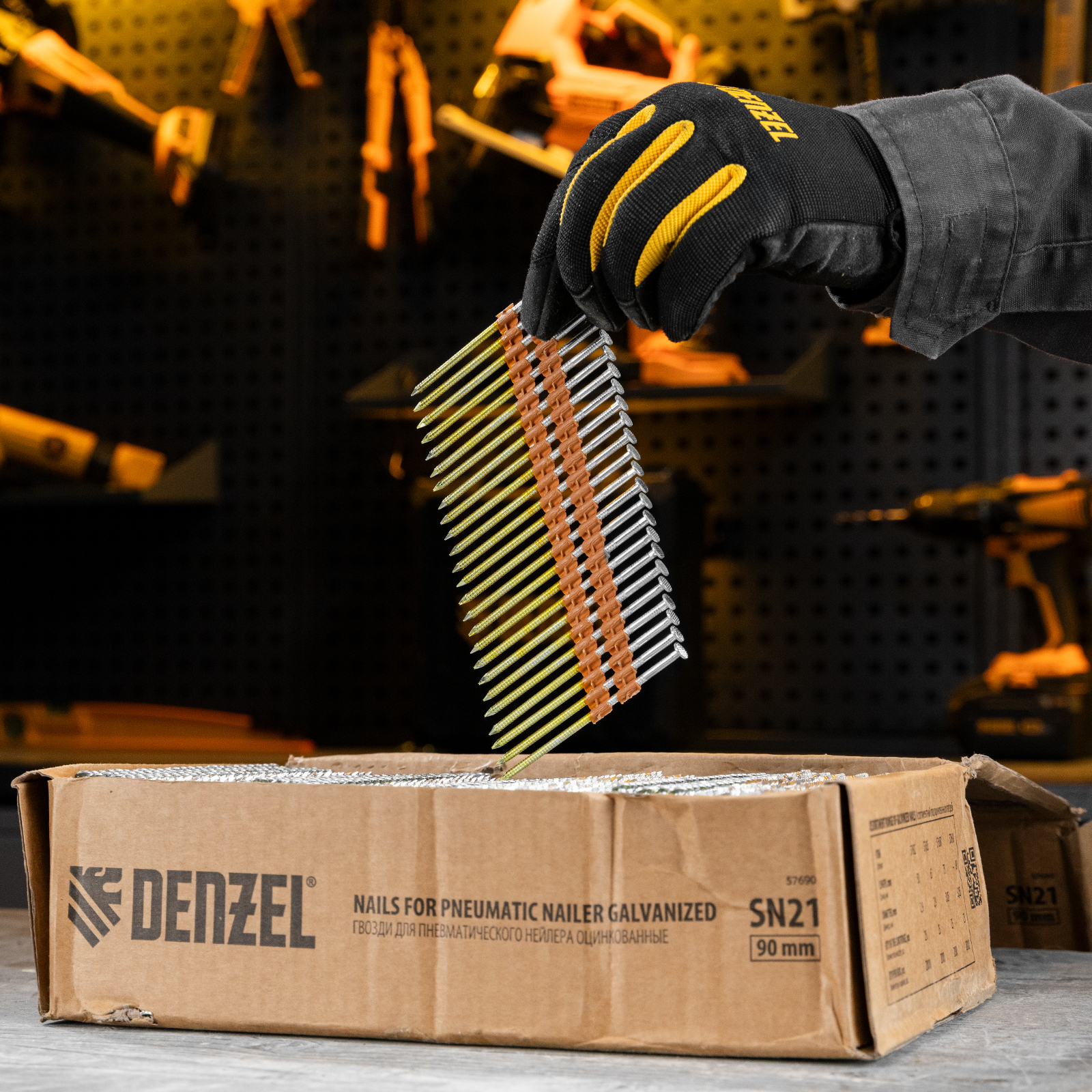 Оцинкованные гвозди Denzel 57690 типа SN21, длиной 90 мм и диаметром 3,05 мм, 2000 шт. в упаковке, — расходники для пневматического нейлера. Используются для скрепления различных материалов, будут полезны во время сборочных и отделочных работ.