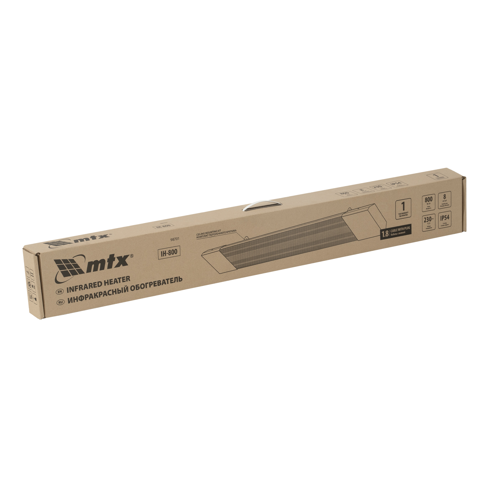 Инфракрасный обогреватель MTX IH-800 98701 подключается к сети 230 В, потребляет мощность до 800 Вт, защищен по стандарту IP54 и оснащен кабелем длиной 1,8 м с вилкой. Предназначен для обогрева помещений, благодаря высокой степени защиты IP54 не боится влаги, поэтому может быть установлен на улице под открытым небом, на открытых верандах, в беседках, курятниках, теплицах и подвальных помещениях, часто используется для сушки деревянных поверхностей. Служит основным источником тепла на площади до 8 м² и дополнительным — в помещениях до 16 м². Произведен в России.