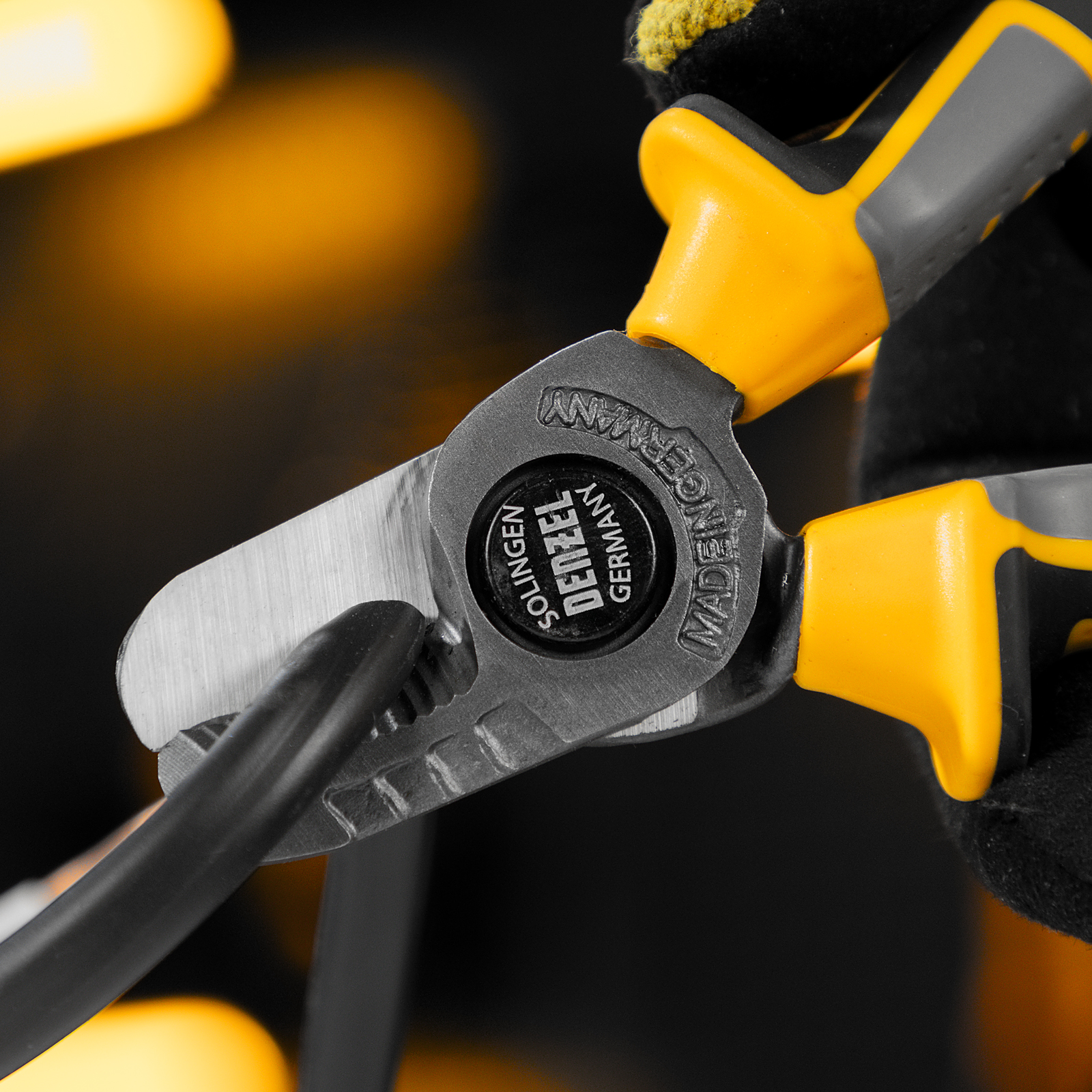 Кабелерез Denzel 17729 длиной 160 мм, с трехкомпонентными рукоятками, — инструмент для зачистки проводов и разрезания электрических кабелей. Способен перерезать кабель из алюминия и меди диаметром до 16 мм или сечением 50 кв. мм.