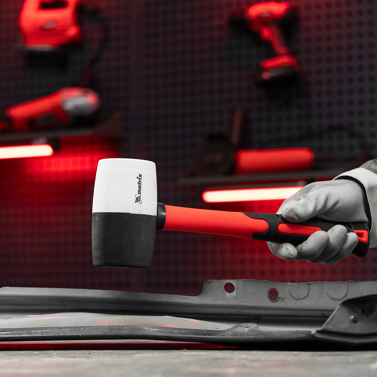 Резиновая киянка Matrix 11172 из черно-белой резины, с фибергласовой рукояткой и бойком весом 680 г, применяется при проведении монтажных, сборочных и кузовных работ, для укладки плитки. Инструмент обладает высоким показателем прочности, стойкостью к воздействию внешней агрессивной среды и хорошим вибропоглощением, поэтому подходит для профессионального применения.