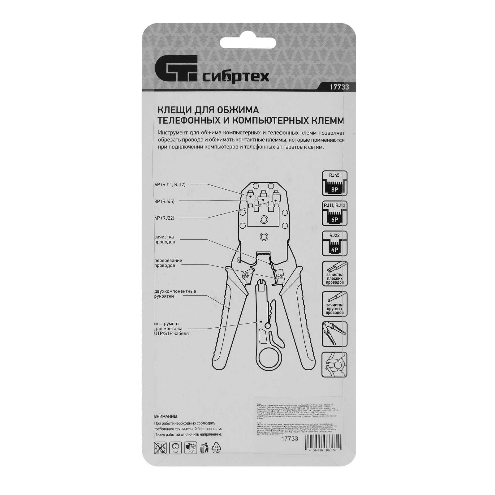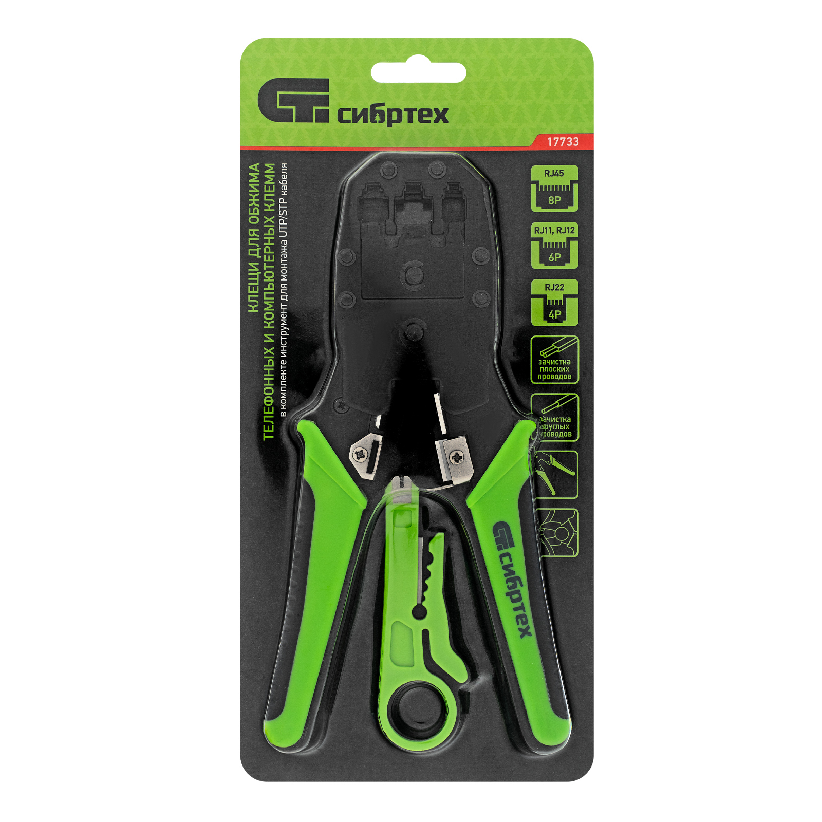 Клещи Сибртех 17733 применяются для обжима клемм (телефонных 4Р/RJ-22, RJ-11/6Р, 6P/RJ-12, компьютерных 8Р/RJ-45), а также имеют функцию обрезания проводов. Пригодятся для бытовых и профессиональных работ с телефонными и сетевыми линиями.