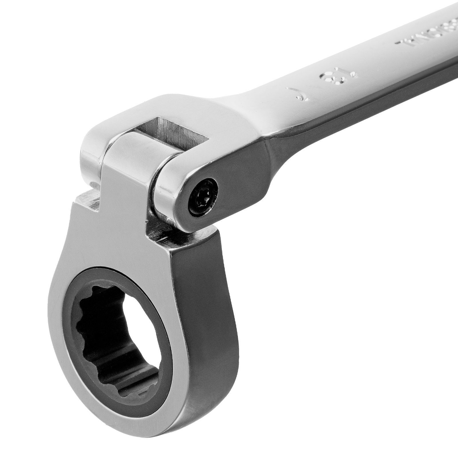 - Удобная работа в труднодоступных местах — храповой механизм на 72 зуба обеспечивает плавное вращение (шаг трещотки составляет 5°), а шарнир позволяет поворачивать рабочую часть под углом.
