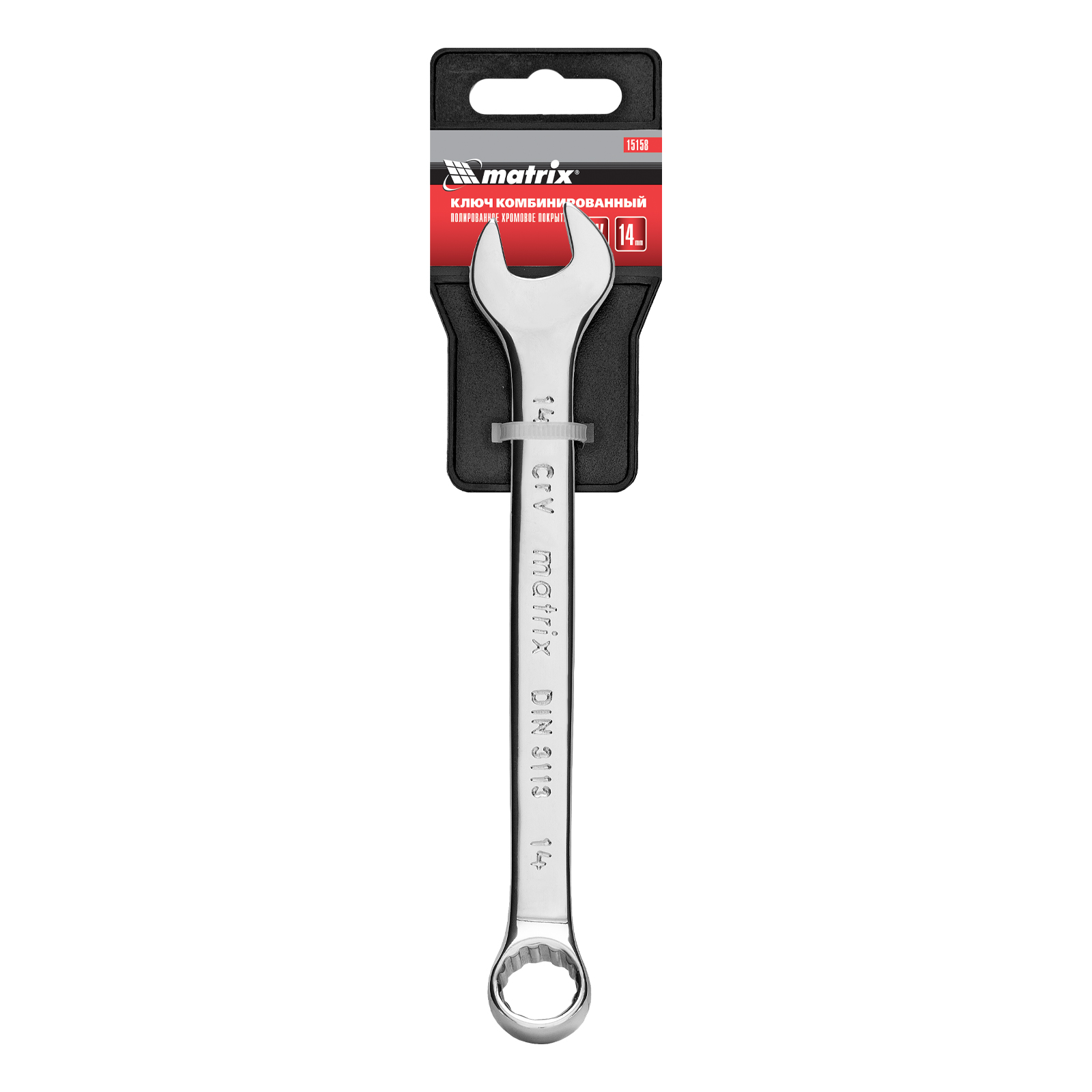 Комбинированный ключ Matrix 15158 размером 14 мм, из стали CrV, с покрытием «полированный хром», пригодится во время ремонтных работ дома или в гараже. С его помощью можно быстро монтировать и демонтировать крепежные элементы. Угол наклона кольцевого зева относительно плоскости инструмента составляет 15°, поэтому ключом удобно работать в труднодоступных местах.