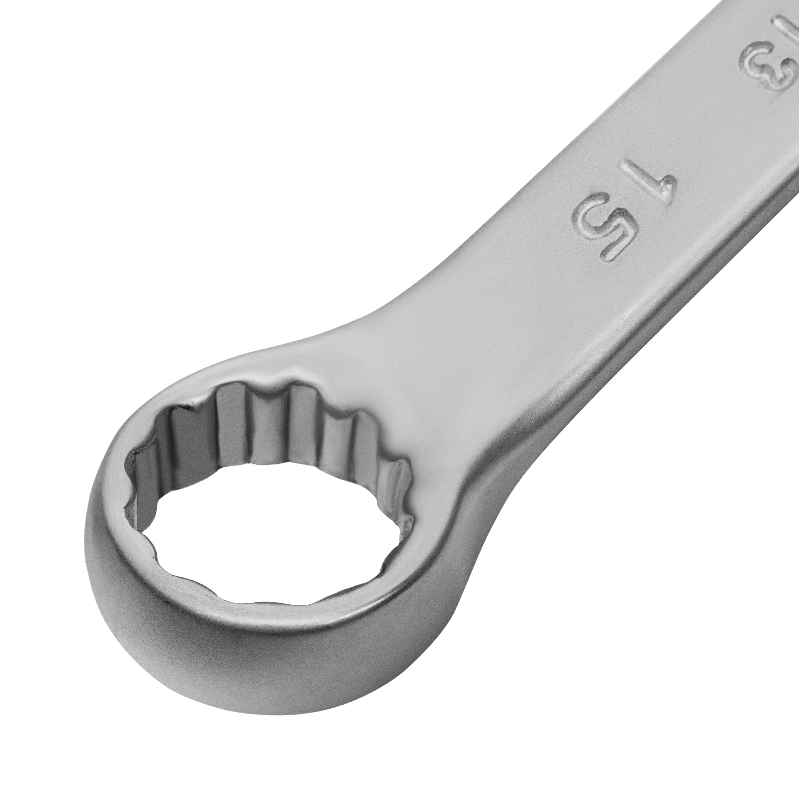 Комбинированный ключ Matrix 15111 размером 15 мм, из стали CrV, с покрытием «матовый хром», пригодится во время ремонтных работ дома или в гараже. С его помощью можно быстро монтировать и демонтировать крепежные элементы. Угол наклона кольцевого зева относительно плоскости инструмента составляет 15°, поэтому ключом удобно работать в труднодоступных местах.