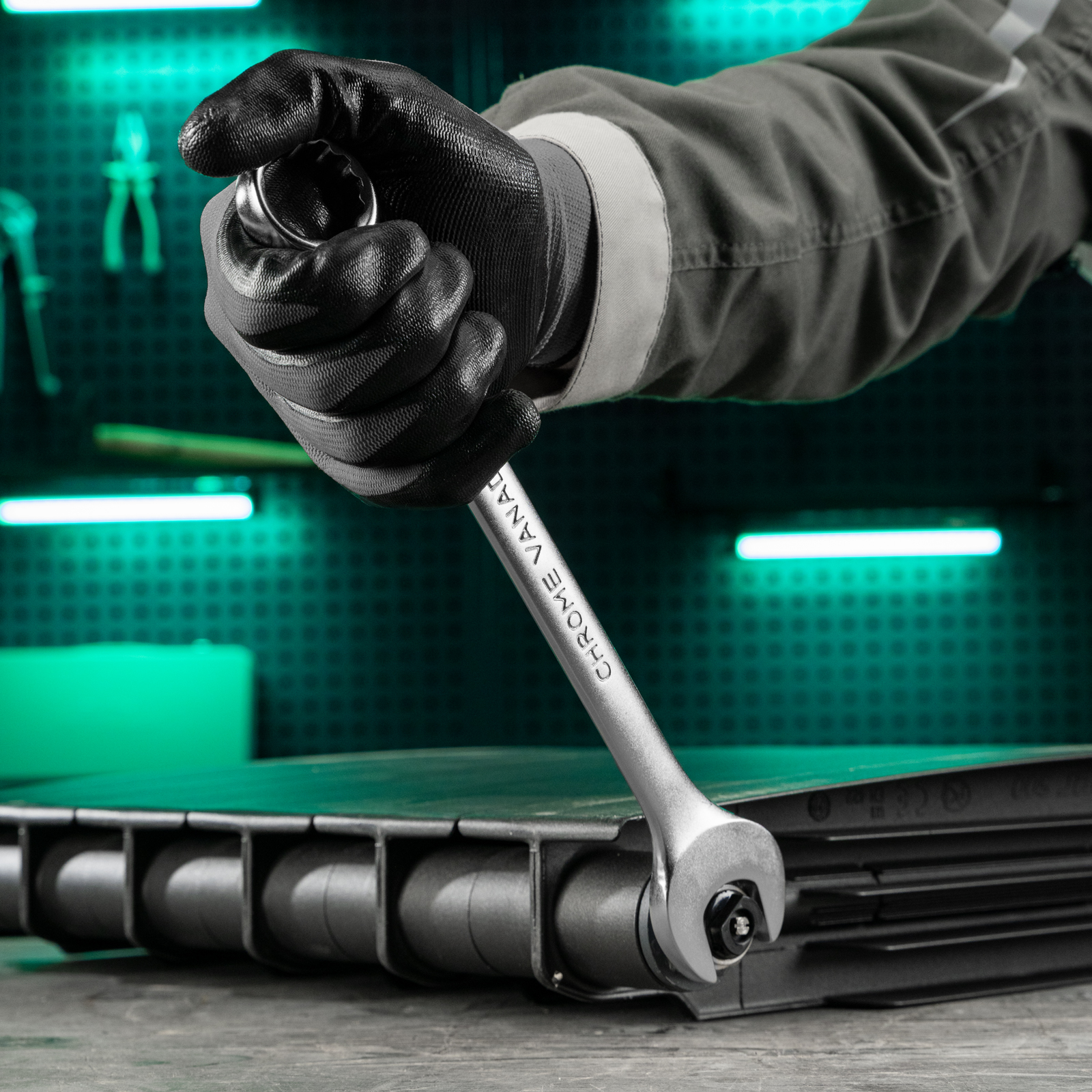 - Высокий показатель прочности — ключ изготовлен из стали хромованадиевой группы, рабочая часть закалена до твердости 45 HRC.