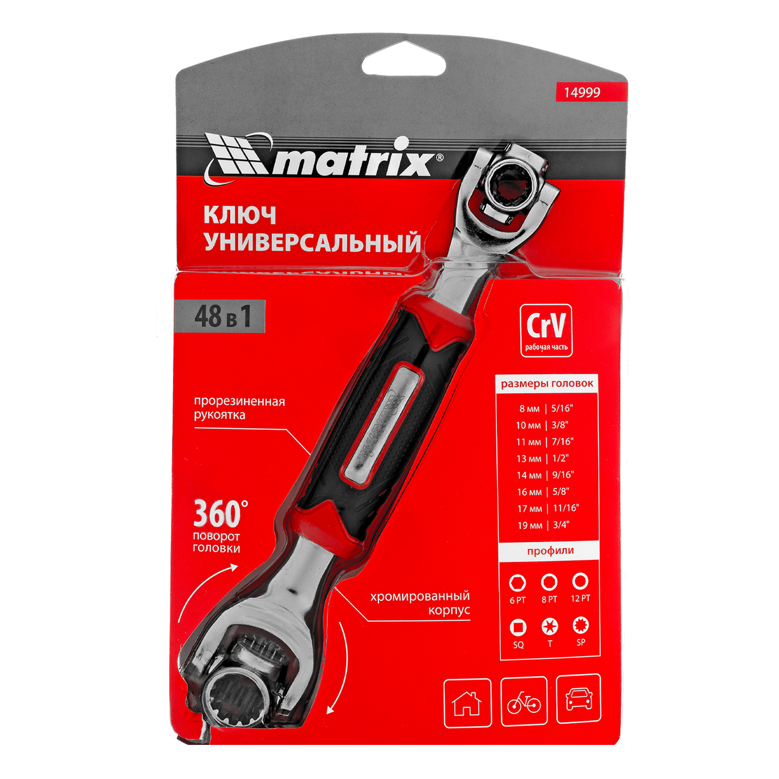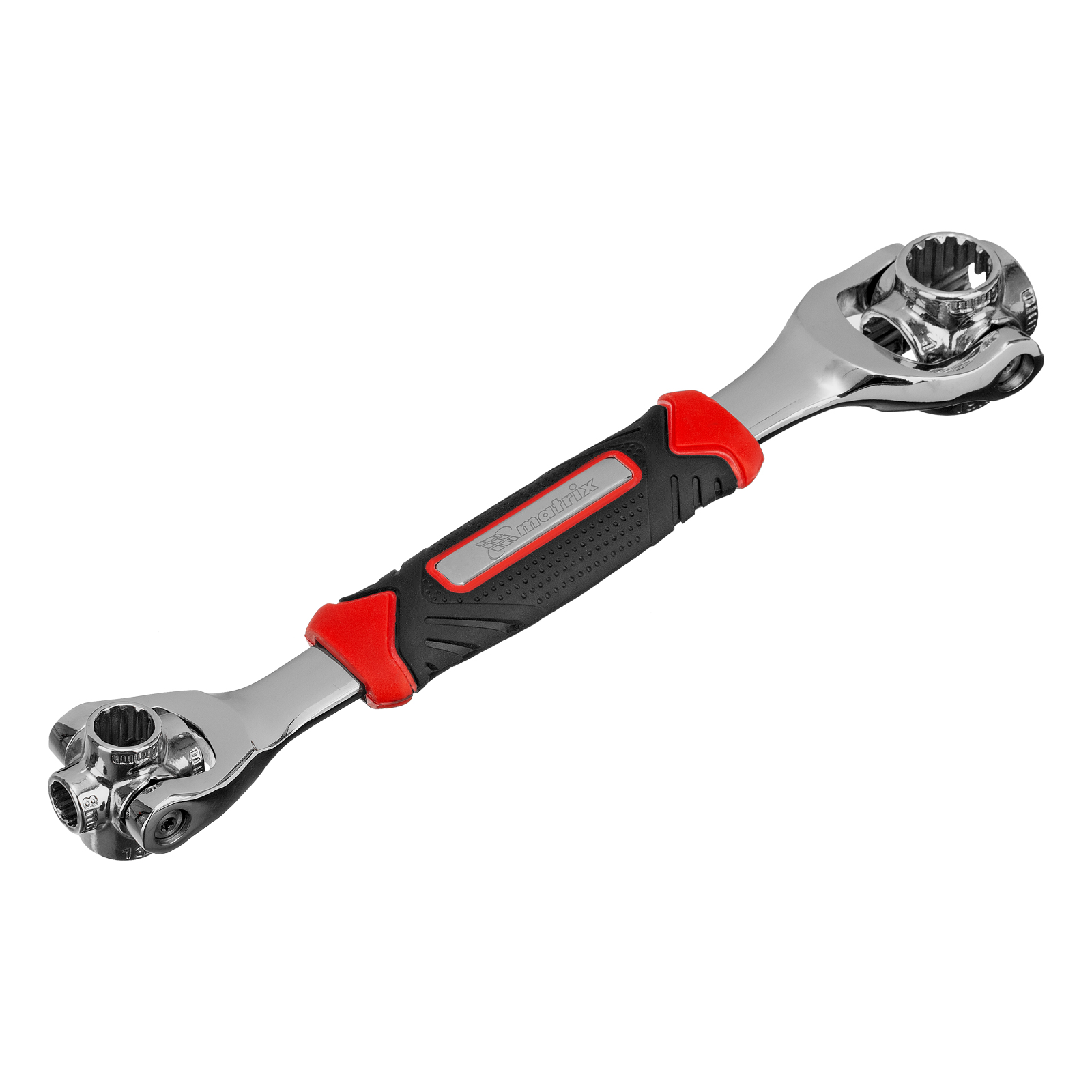 Ключ универсальный 48 в 1 Matrix 14999 из стали CrV имеет 8 размеров головок: 8 мм, 10 мм, 11 мм, 13 мм, 14 мм, 16 мм, 17 мм, 19 мм. Подходит для различных профилей: 6-гранных, 8-гранных, 12-гранных, Square, Torx, Spline. Предназначен для монтажа и демонтажа болтовых соединений. Поворот головки на 360° и угол наклона 45° позволяют работать в труднодоступных местах. Конструкция головки позволяет закручивать и откручивать крепежи на высоких шпильках.