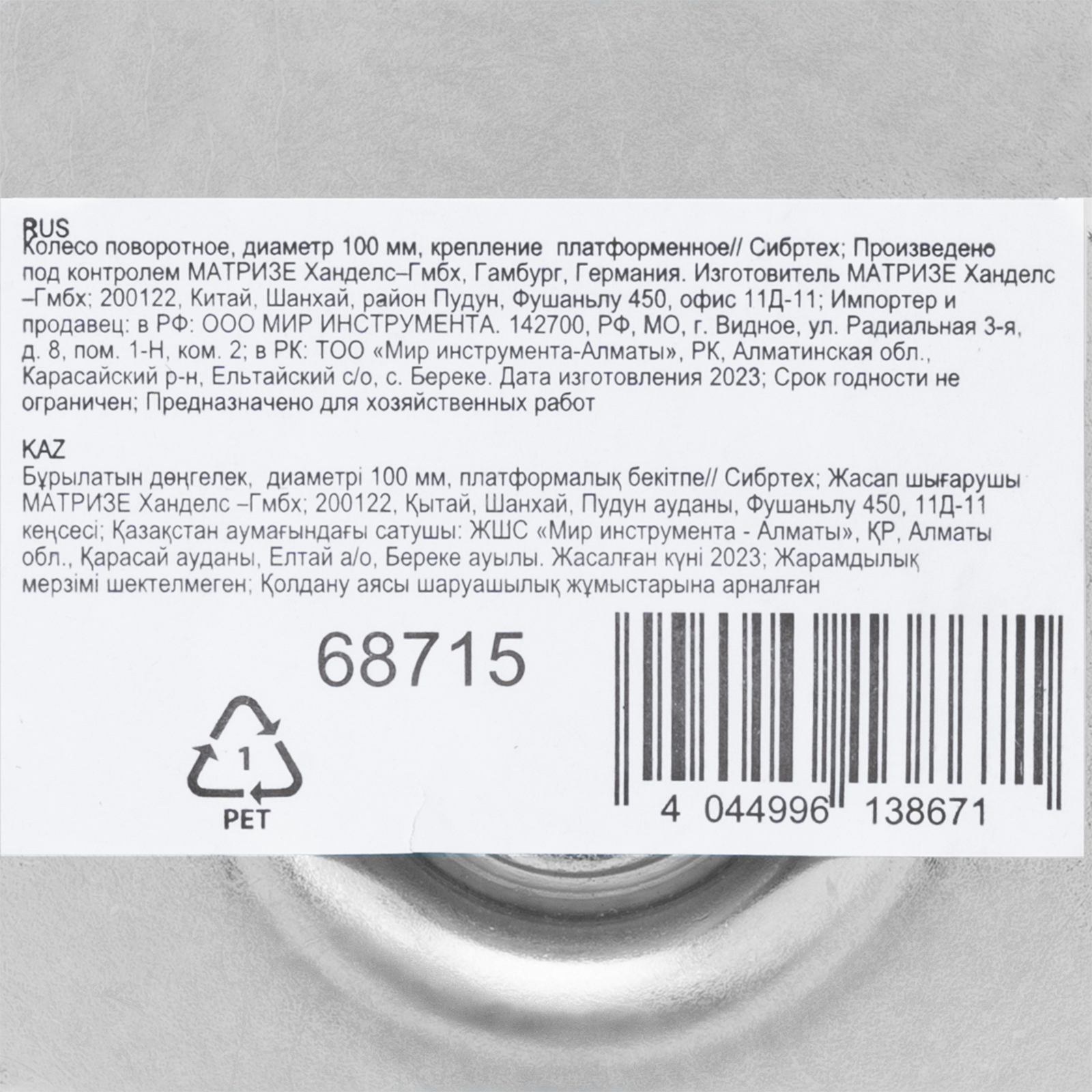 Колесо поворотное D 100 мм, крепление платформенное Сибртех в Воронеже