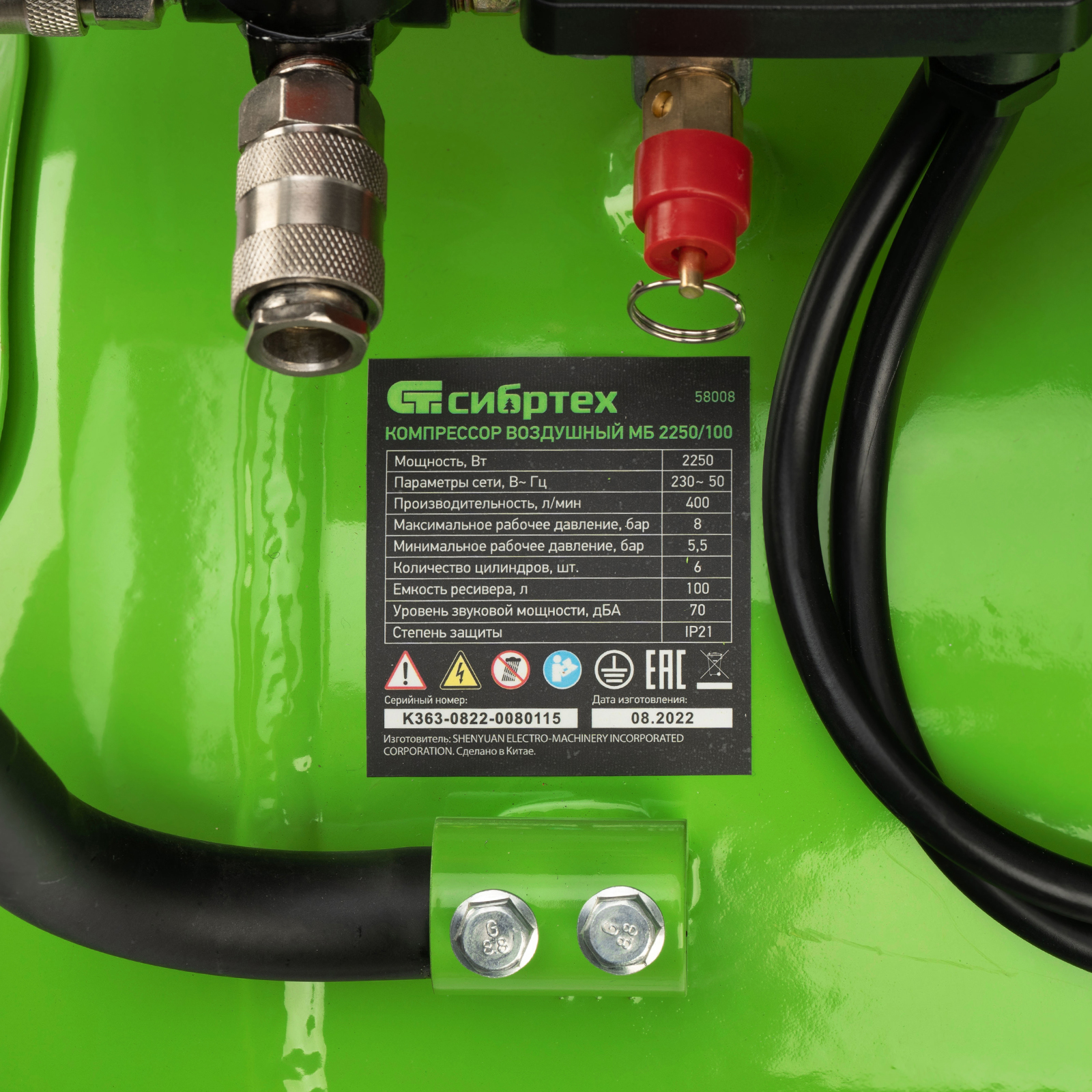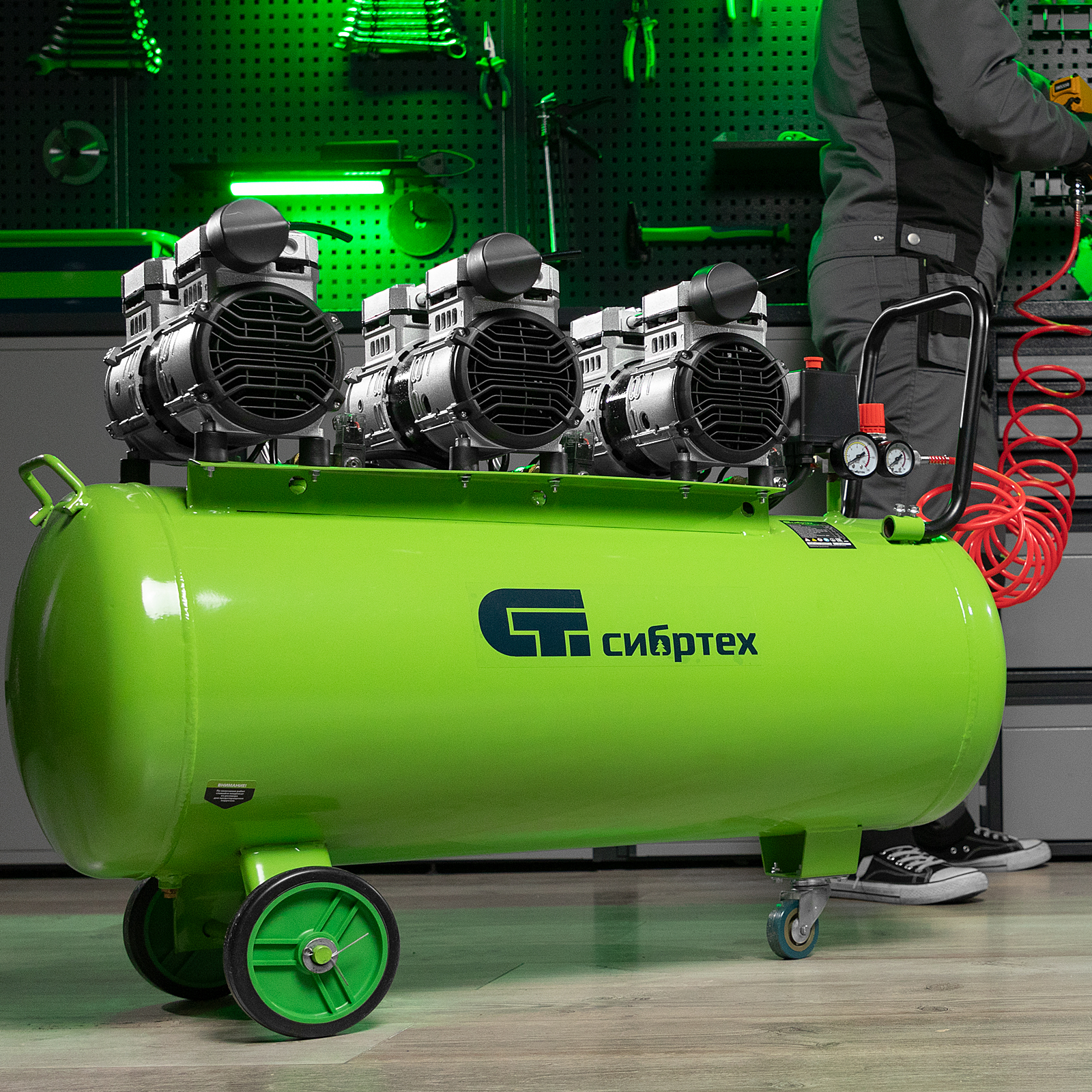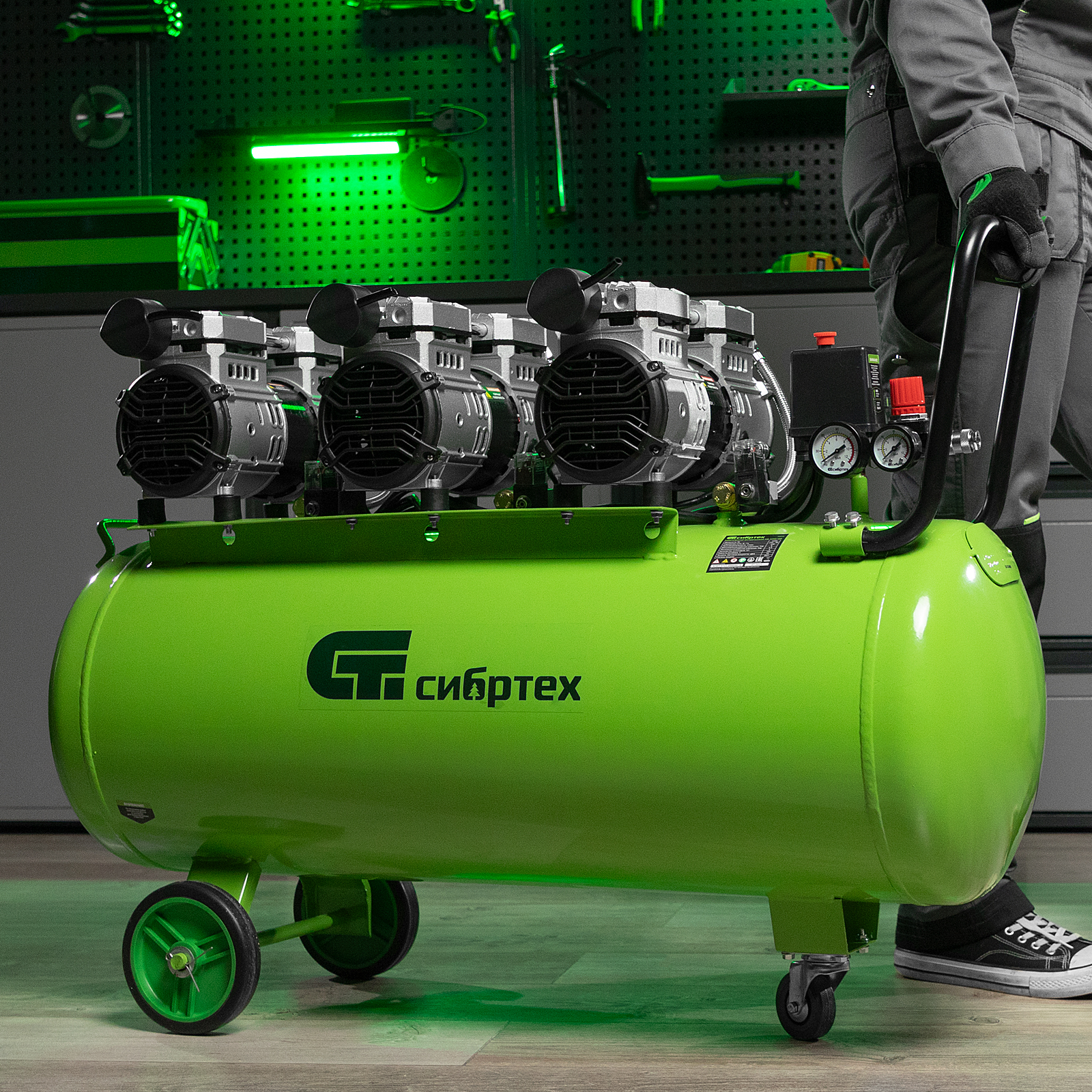 Безмасляный малошумный компрессор Сибртех МБ 2250/100 58008 мощностью 2250 Вт и объемом ресивера 100 л имеет производительность на входе 400 л/мин и сжимает воздух под давлением до 8 бар. Используется для обеспечения функционирования пневмоинструмента, например, краскораспылителя, перфоратора или пневматического шуруповерта. Для работы устройства не требуется масло, поэтому воздух на выходе не содержит его частиц. Компрессор оптимален для проведения покрасочных работ и продувки электронных компонентов.,Одна из ключевых особенностей компрессора — низкий уровень шума (не превышает 70 дБ), позволяющий использовать устройство в жилом помещении без дискомфорта для людей.