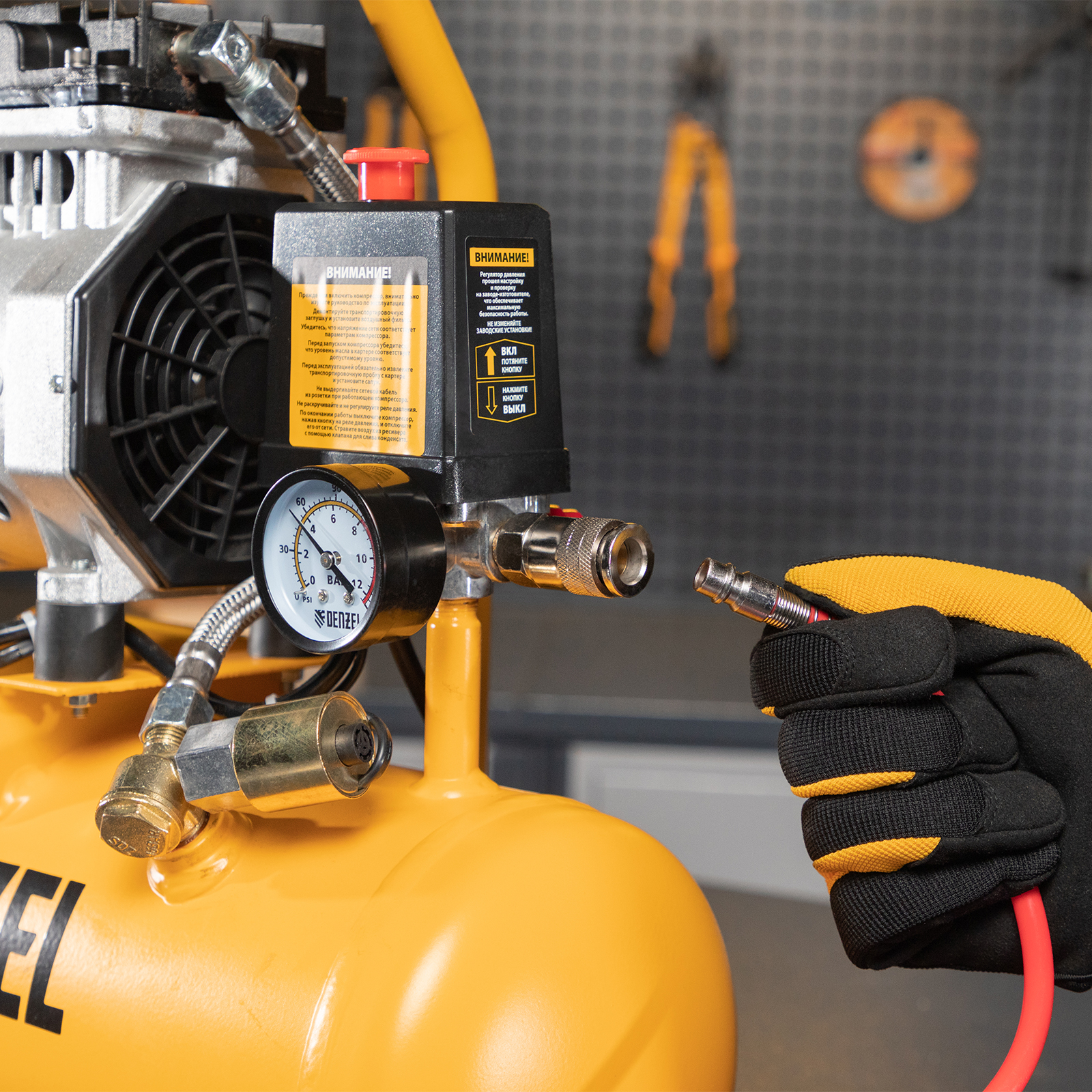 - Манометр — визуальное отслеживание давления сжатого воздуха значительно повышает безопасность работы.