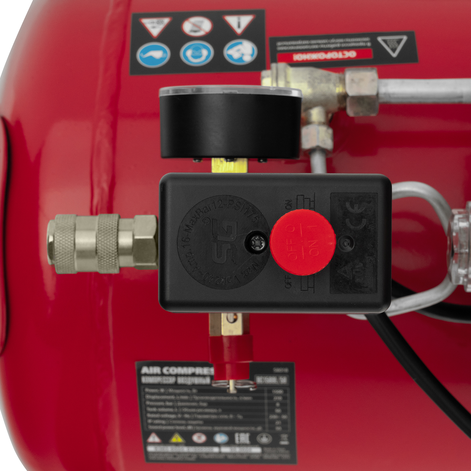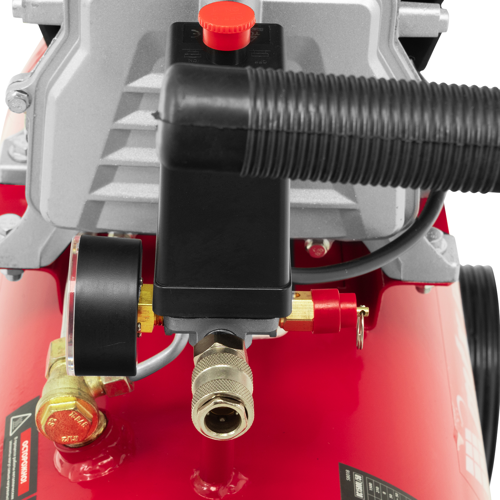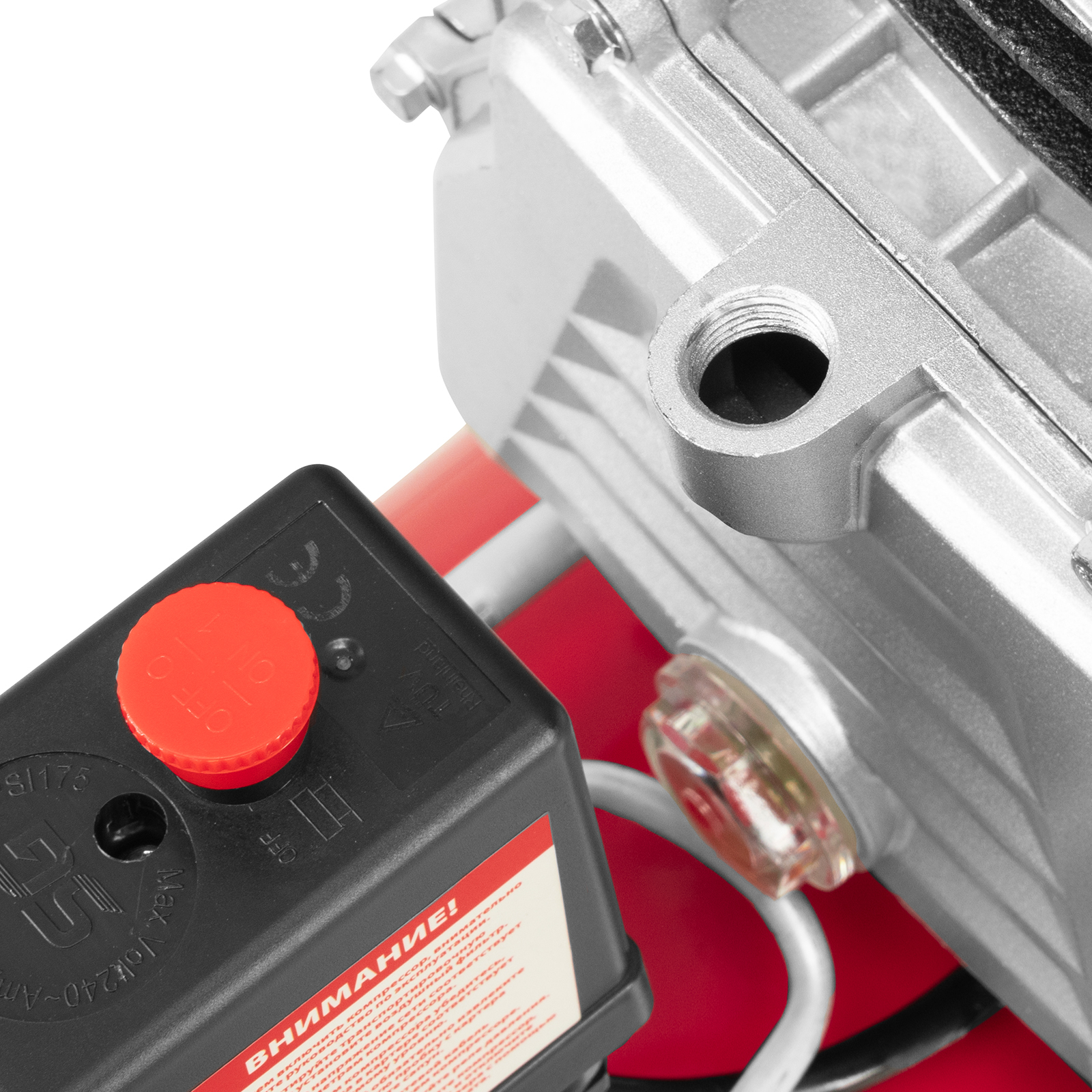 - Удобный контроль давления в ресивере — компрессор оснащен механическим манометром.