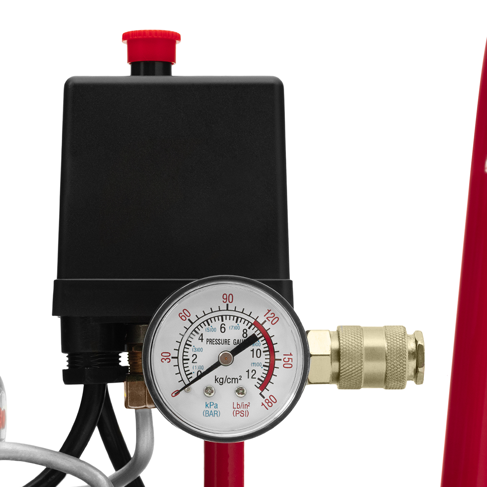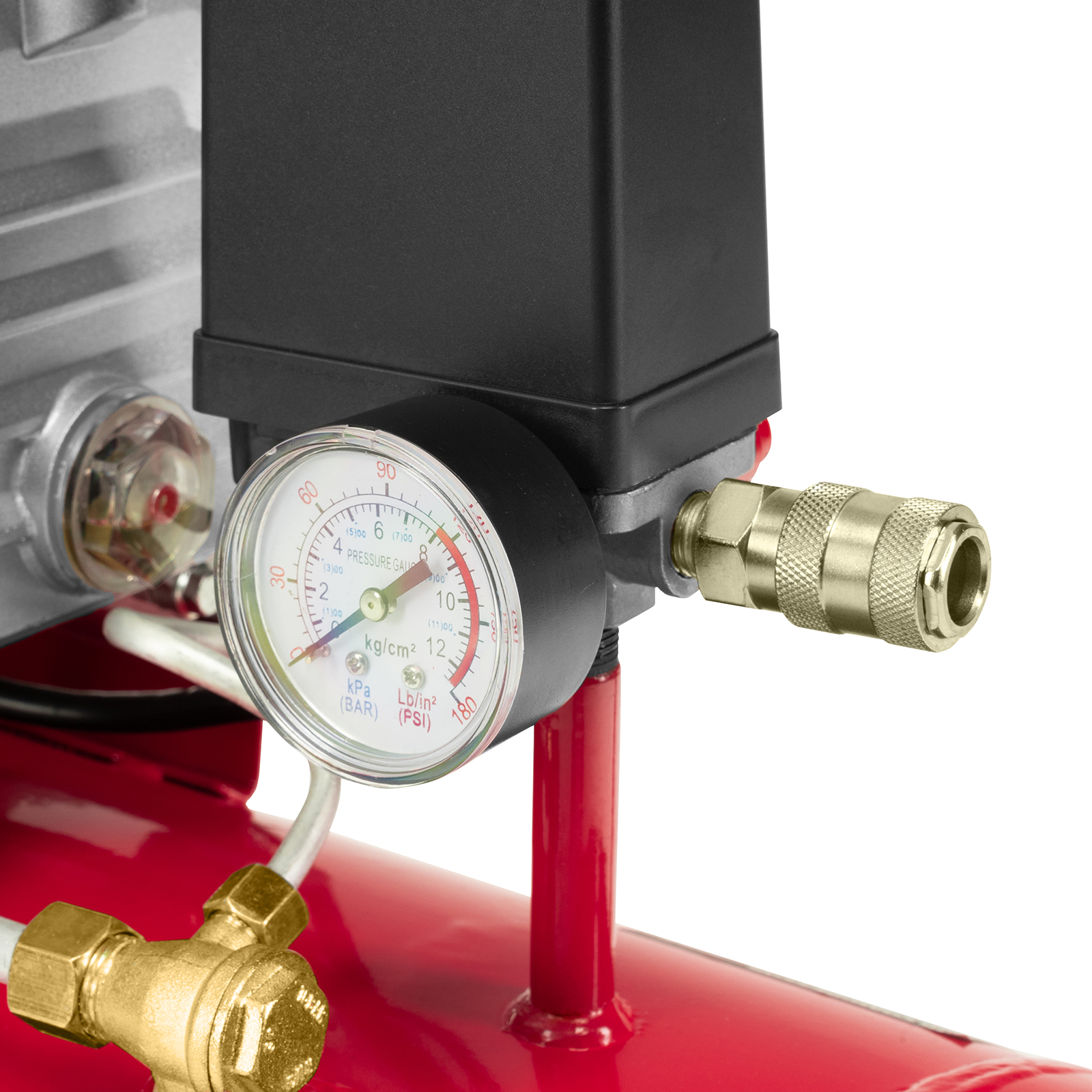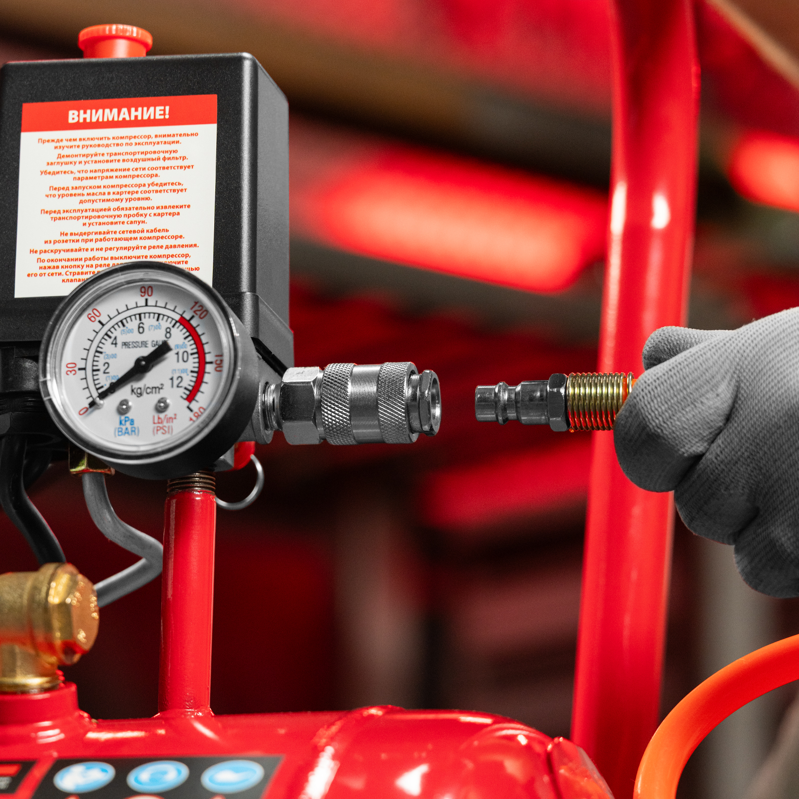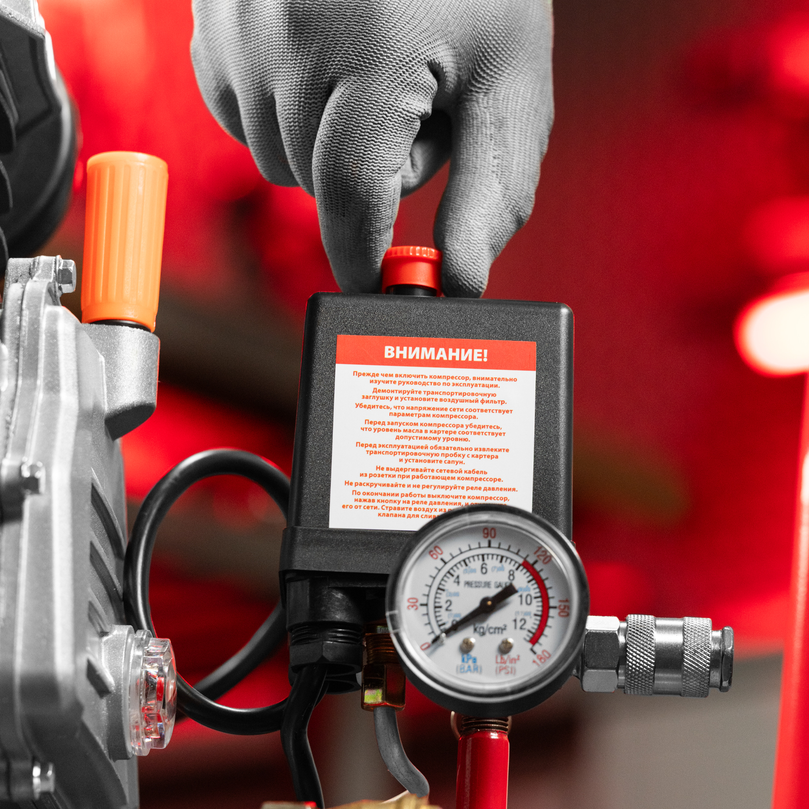 - Удобный контроль давления в ресивере — компрессор оснащен механическим манометром.