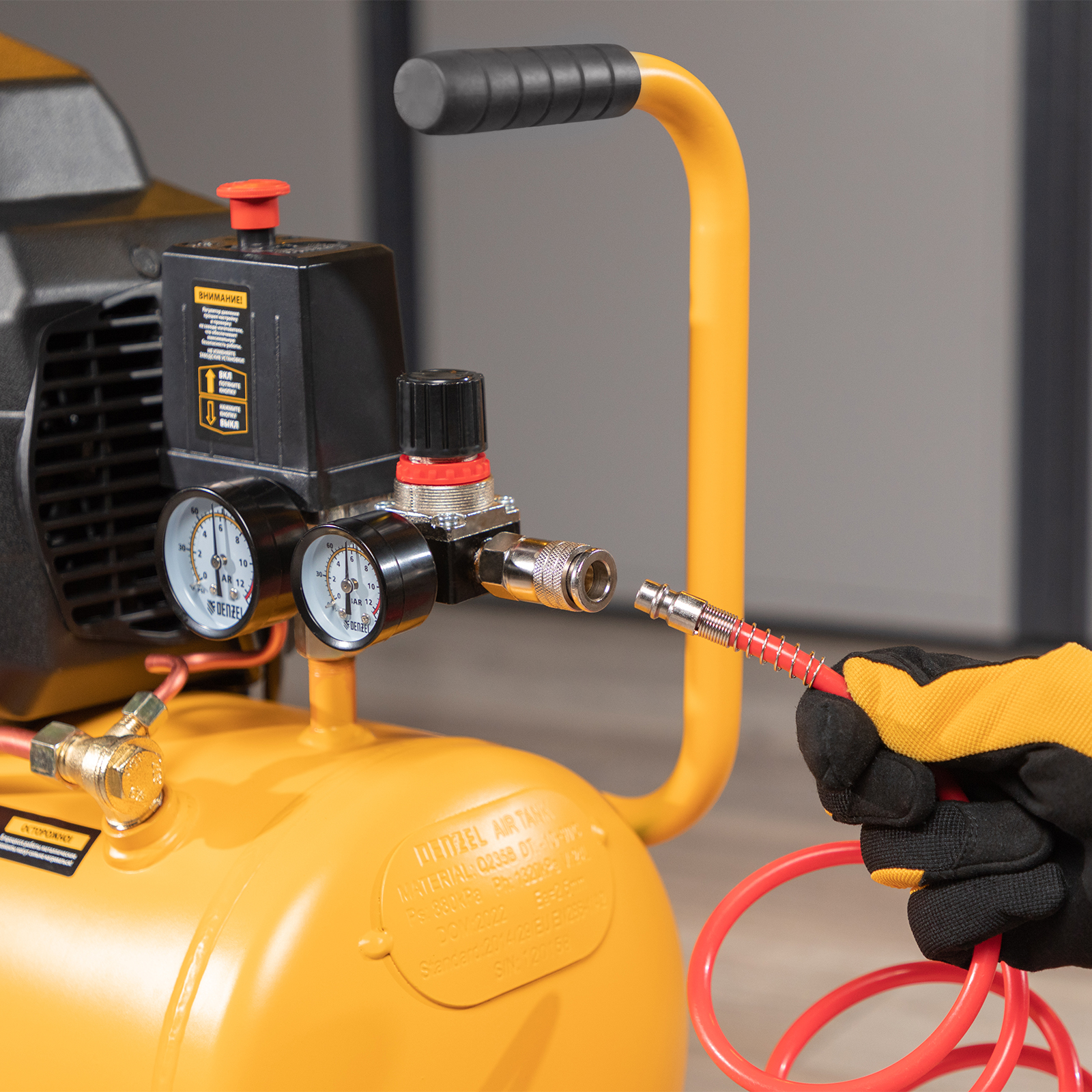 - Удобный контроль рабочих параметров — 2 манометра отображают давление в ресивере и выходной магистрали.