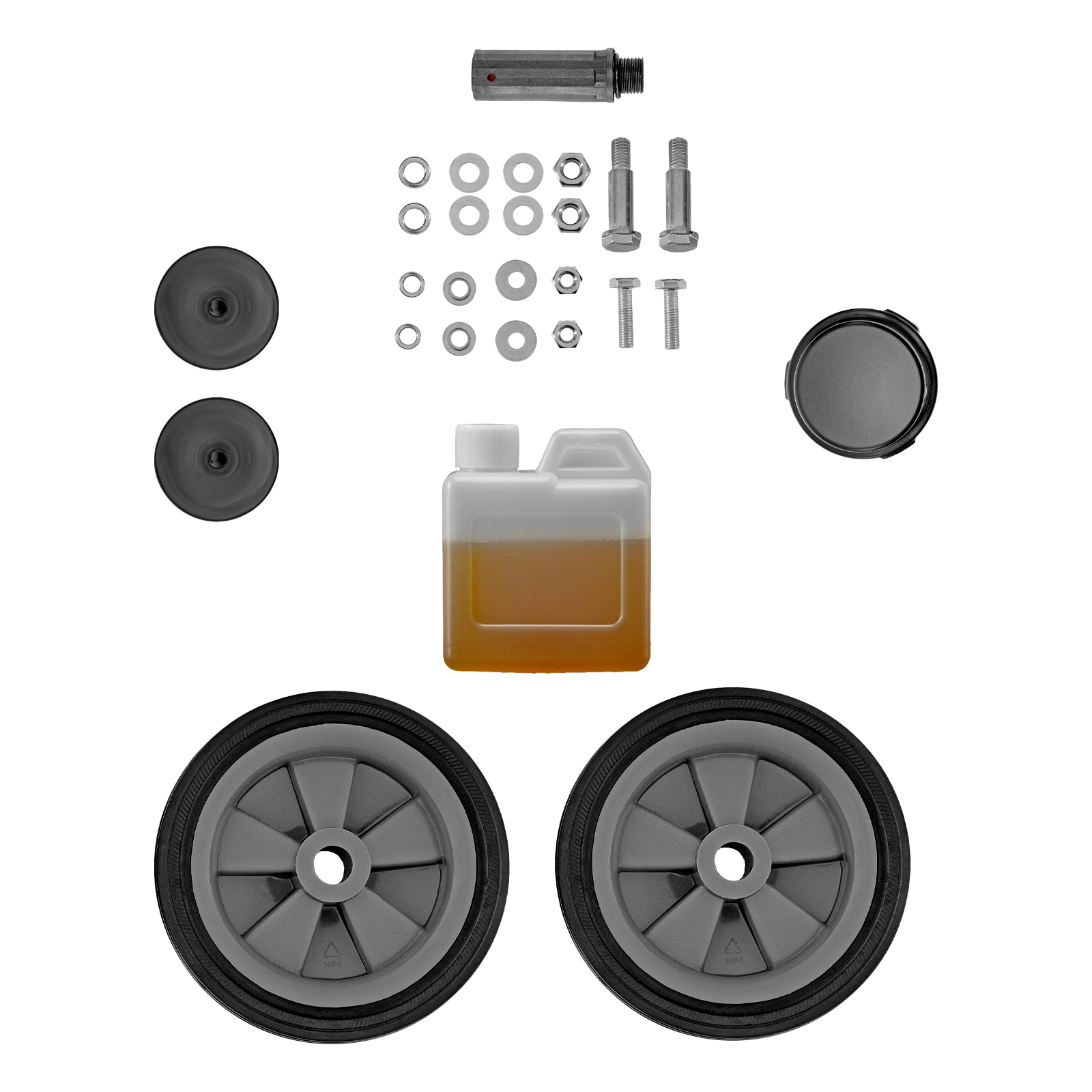 - Мобильность — транспортировочные колеса позволяют легко перемещать компрессор по рабочей площадке.