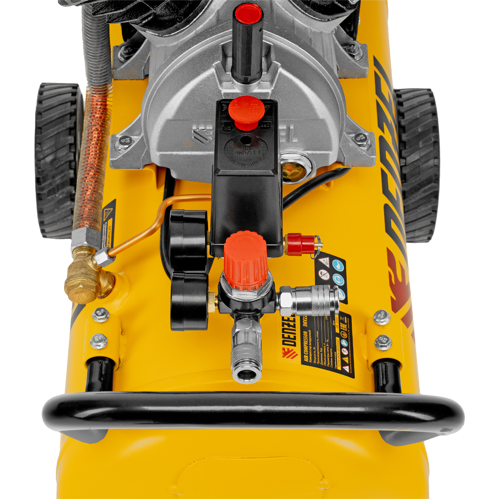 - Удобное перемещение — компрессор оснащен колесами и П-образной ручкой.