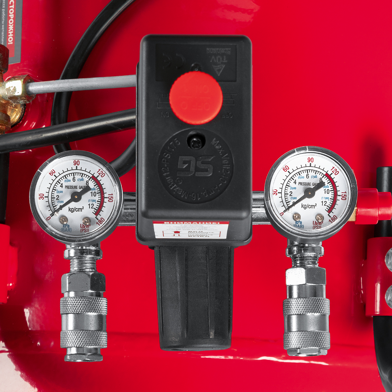 - Удобный контроль рабочих параметров — 2 манометра и регулятор позволяют отслеживать и корректировать давление для корректной работы пневмоинструмента.