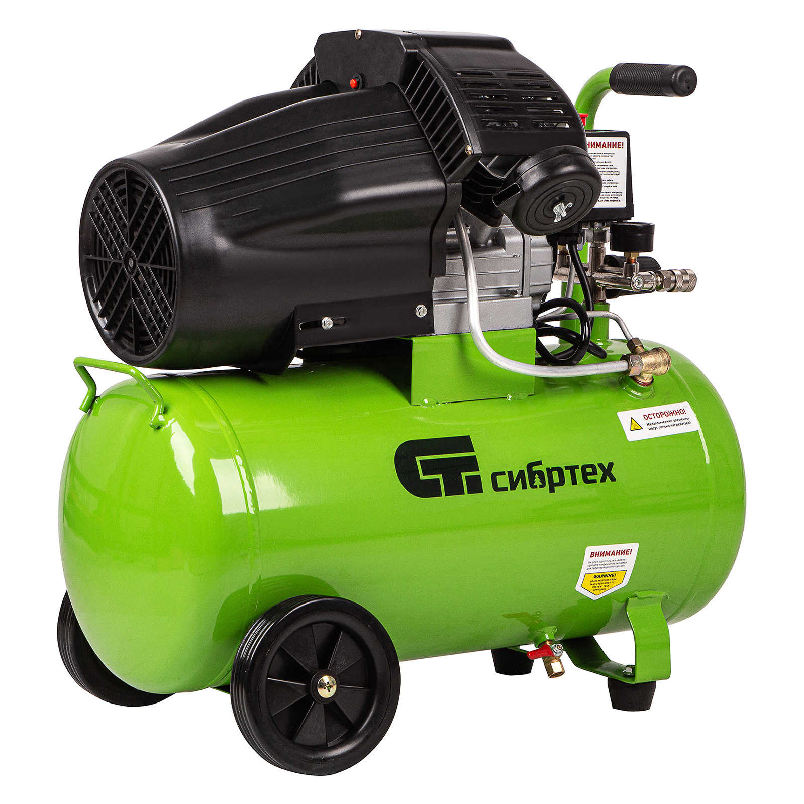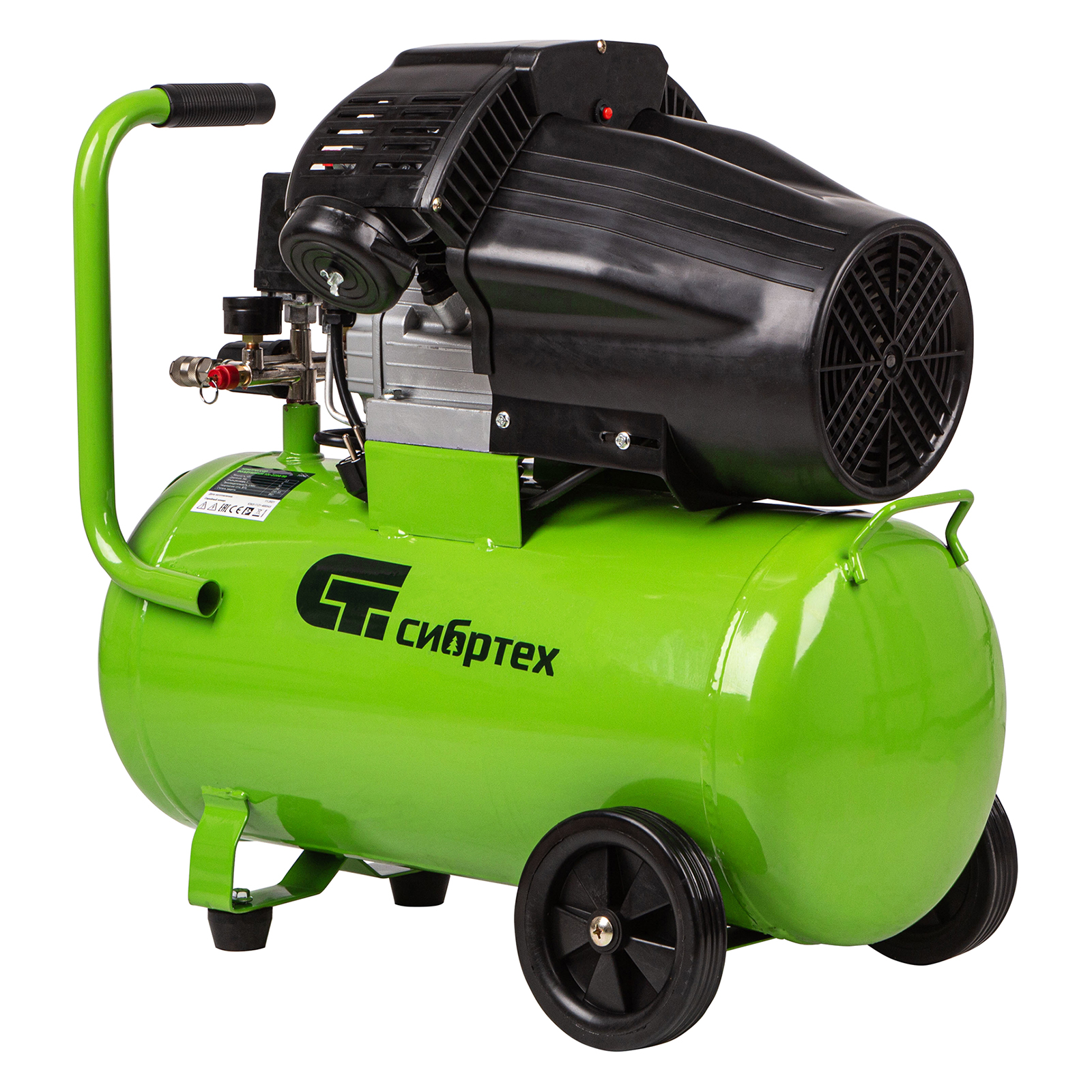 Универсальный передвижной компрессор идеально впишется в бытовые условия, автосервис, гараж, строительную площадку, небольшое производство. Его подключают к пневмоинструментам, например, к гайковерту или продувочному пистолету.,Устройство способно выработать за 1 час 350 л сжатого воздуха. Показатель мощности увеличен до 2.2 кВт, а объем ресивера составляет 50 литров. Двухцилиндровая компоновка, увеличенный магнитопровод статора и автоматизированная намотка двигателя позволили увеличить производительную мощность и достичь высокого рабочего потенциала.,Производитель предусмотрел систему защиты двигателя. Кожух из прочного пластика препятствует попаданию пыли и посторонних частиц в основной узел, сохраняет его от поломок. Системы защиты по току и от перегрева автоматически отключает систему при скачках напряжения и превышении нормальной температуры двигателя.,Еще одно преимущество компрессора — дополнительная обработка картера, которая обеспечивает плотное прилегание прокладок и защиту от протечек масла.