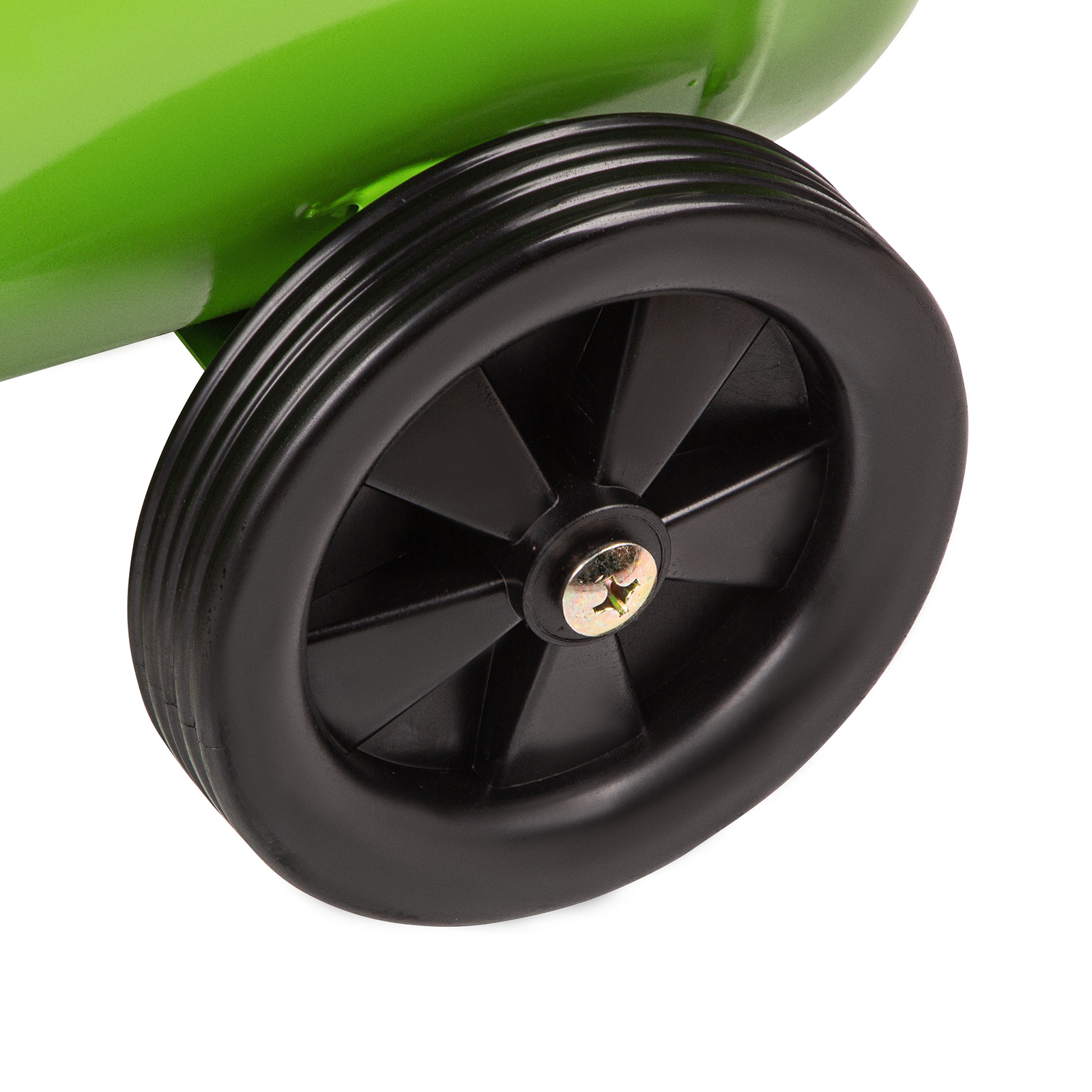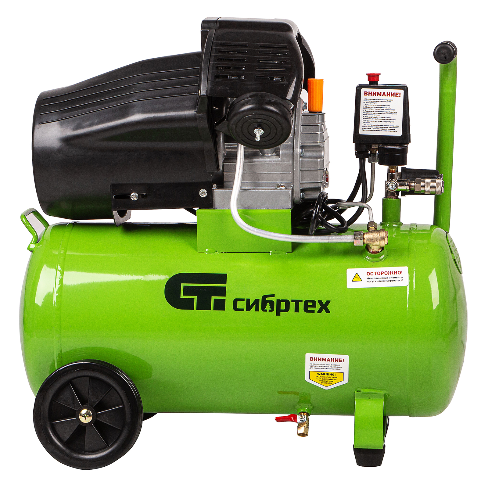 - Простое передвижение — несмотря на мощность и объемный ресивер, модель легко повернуть или переместить благодаря колесам и транспортировочной ручке.