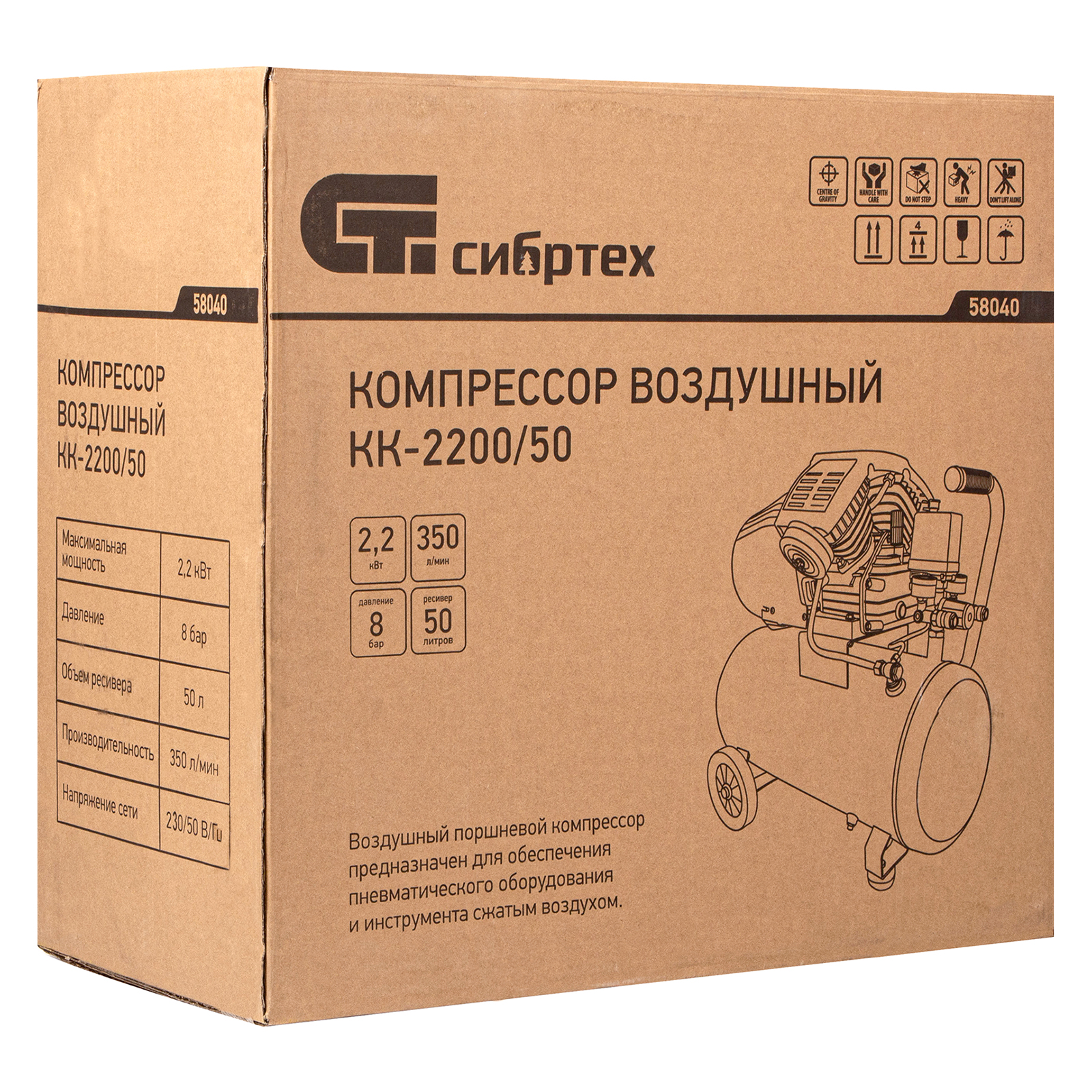 Компрессор воздушный КК-2200/50, 2.2 кВт, 350 л/мин, 50 л, прямой привод, масляный Сибртех в Воронеже