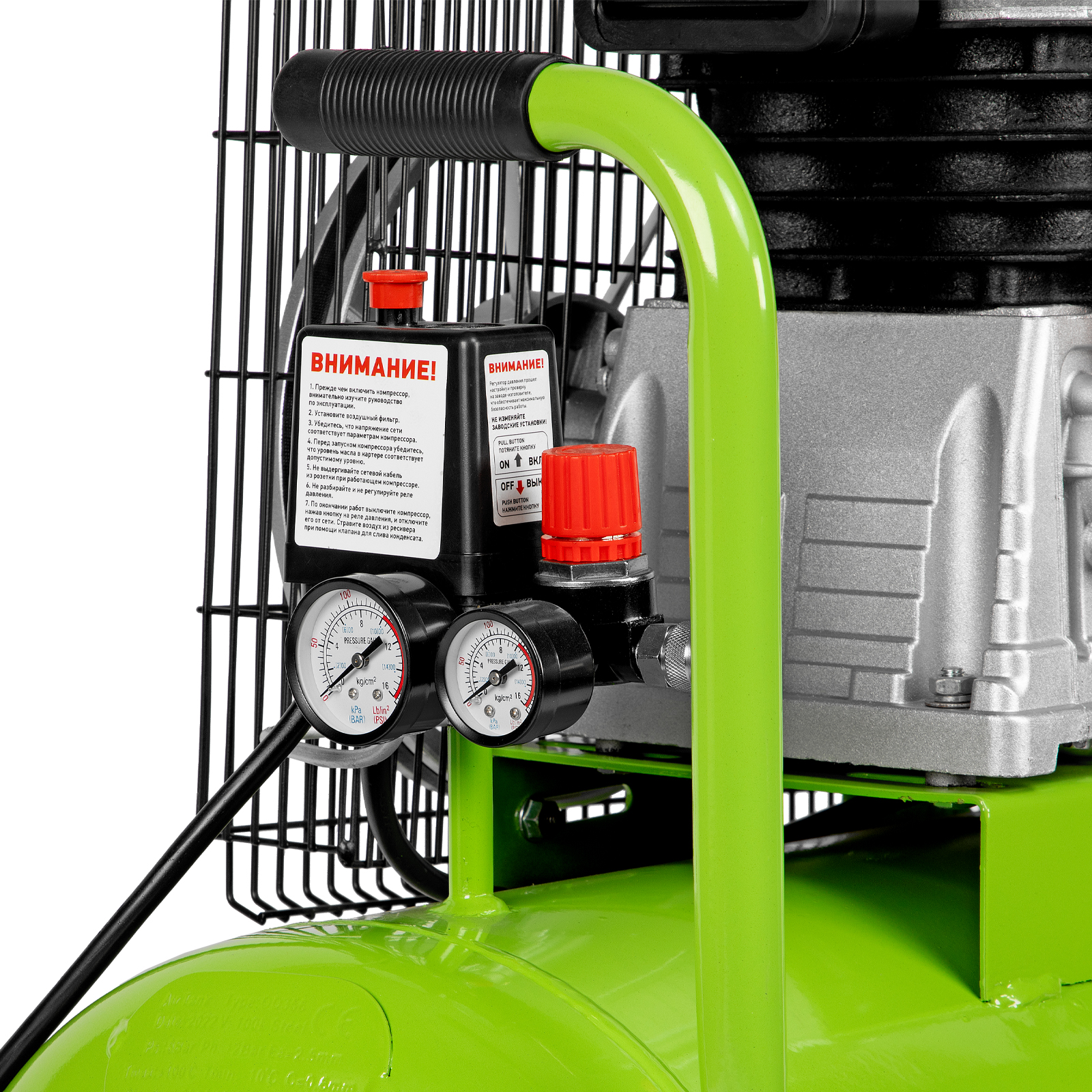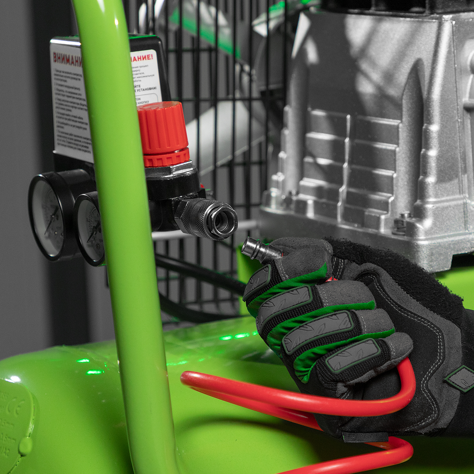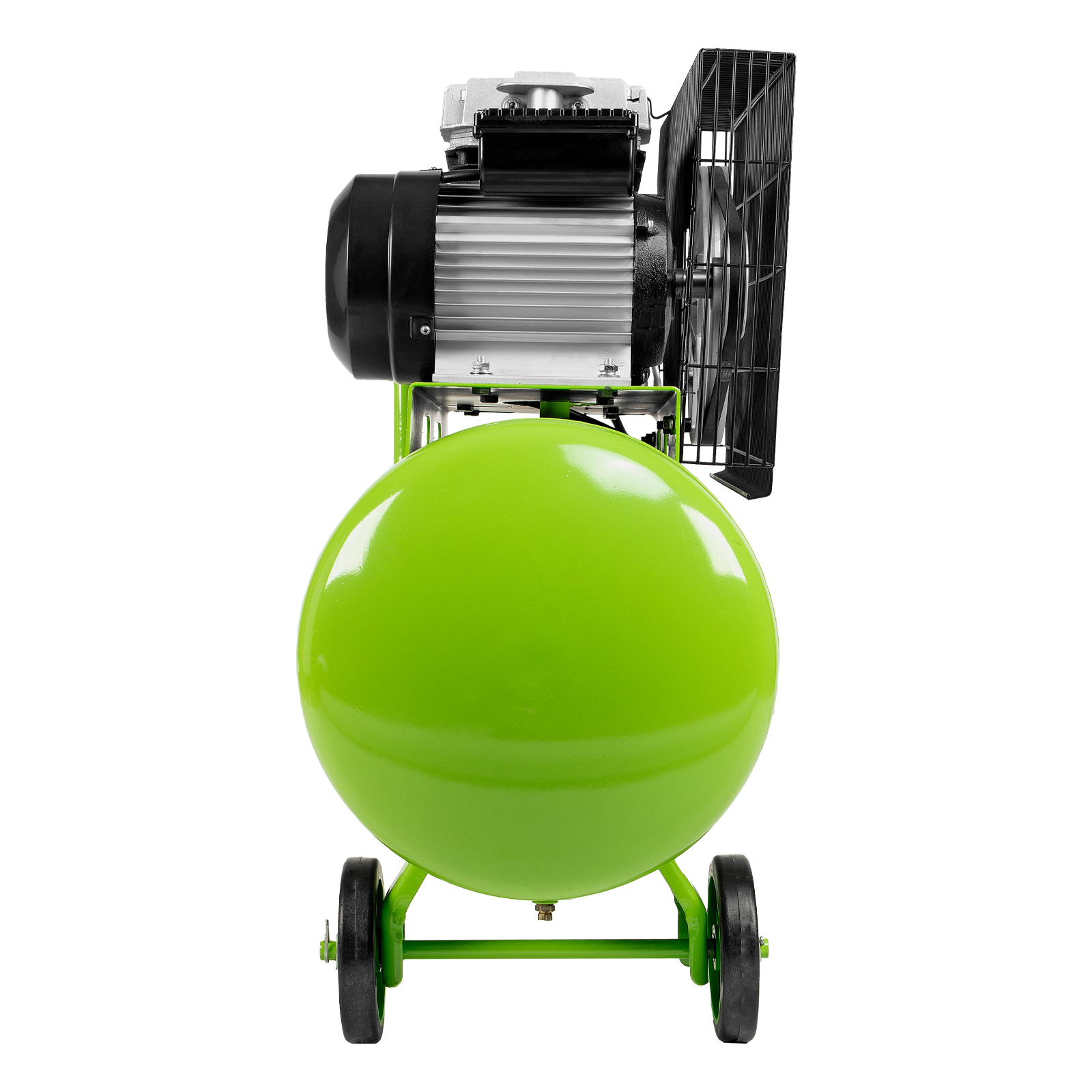 Масляный компрессор с ременным приводом относится к наиболее производительным моделям. Мощность 2.2 кВт, позволяет генерировать 350 л сжатого воздуха в минуту под давлением 10 бар. Такой производительности хватит для долговременных работ на небольших производствах, в автосервисах, на стройках или СТО. Перед сжатием воздух проходит через фильтр очистки, после — отправляется в ресивер объемом 100 л.,Чугунные цилиндры с большими ребрами охлаждения надежно защищают двигатель от перегрева. Встроенная защита от перегрузки отключит двигатель в случае необходимости, что позволит избежать поломки. Ременной привод защищен металлическим кожухом для безопасности оператора.