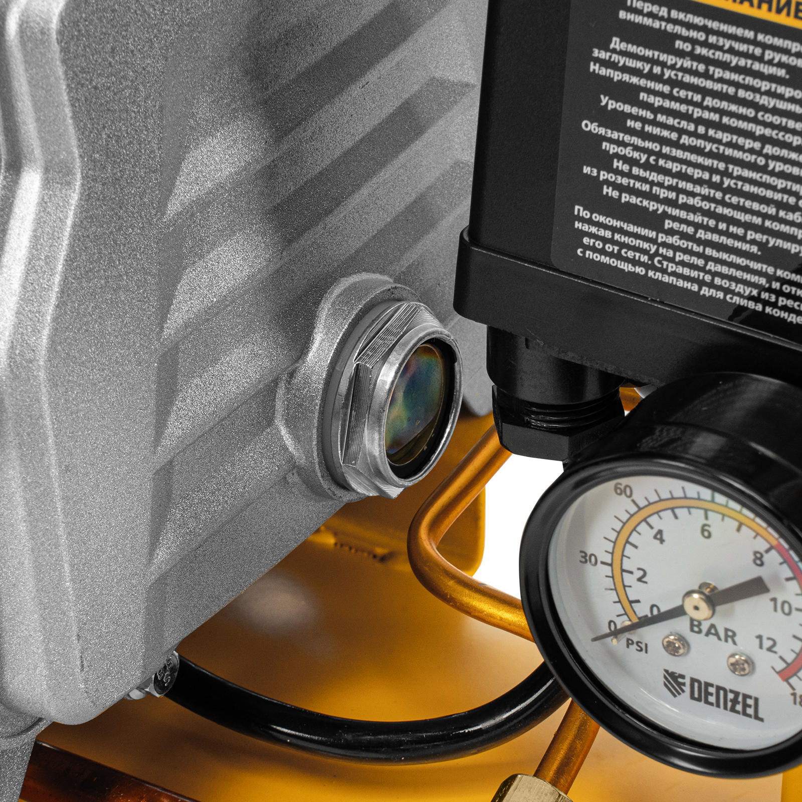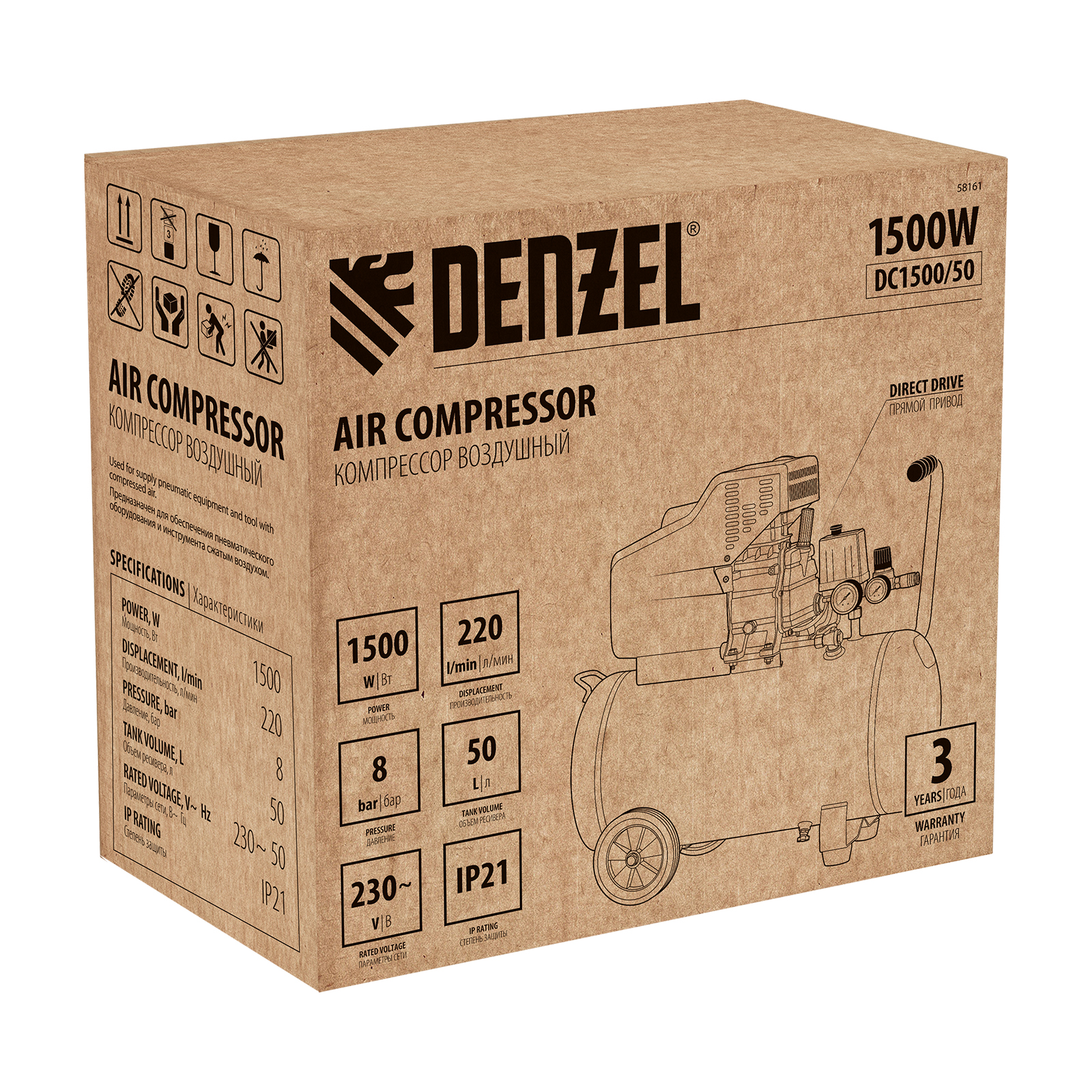 Воздушный компрессор с прямым приводом Denzel DC1500/50 58161 мощностью 1,5 кВт и производительностью 220 л/мин, с объемом ресивера 50 л, используется для подачи сжатого воздуха к пневмоинструменту, например, пневмогайковерту, пневмодрели, пневмостеплеру, пневмозубилу. Благодаря использованию смазочного масла, которое снижает износ деталей, компрессор выдерживает длительную работу и подходит для профессионального применения в автомастерской, гараже или на строительной площадке.