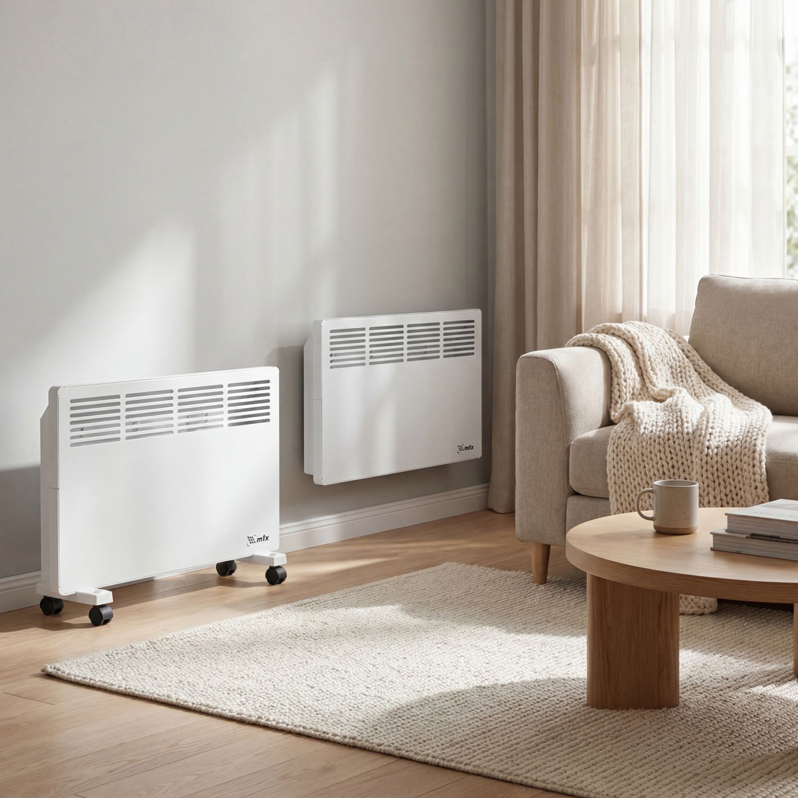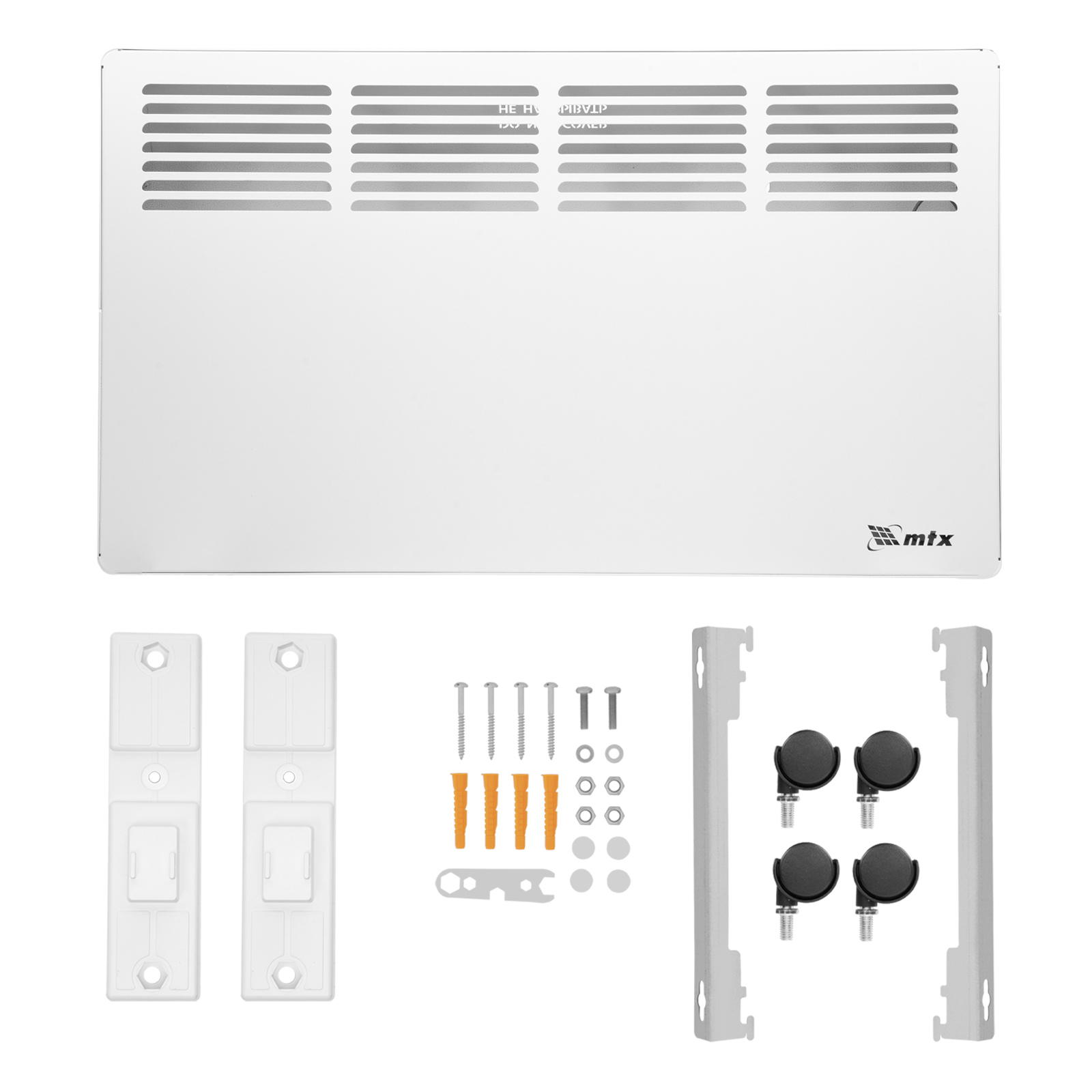 - Два варианта монтажа — конвектор можно расположить на полу или повесить на стену (колесные пары и кронштейн входят в комплект поставки).