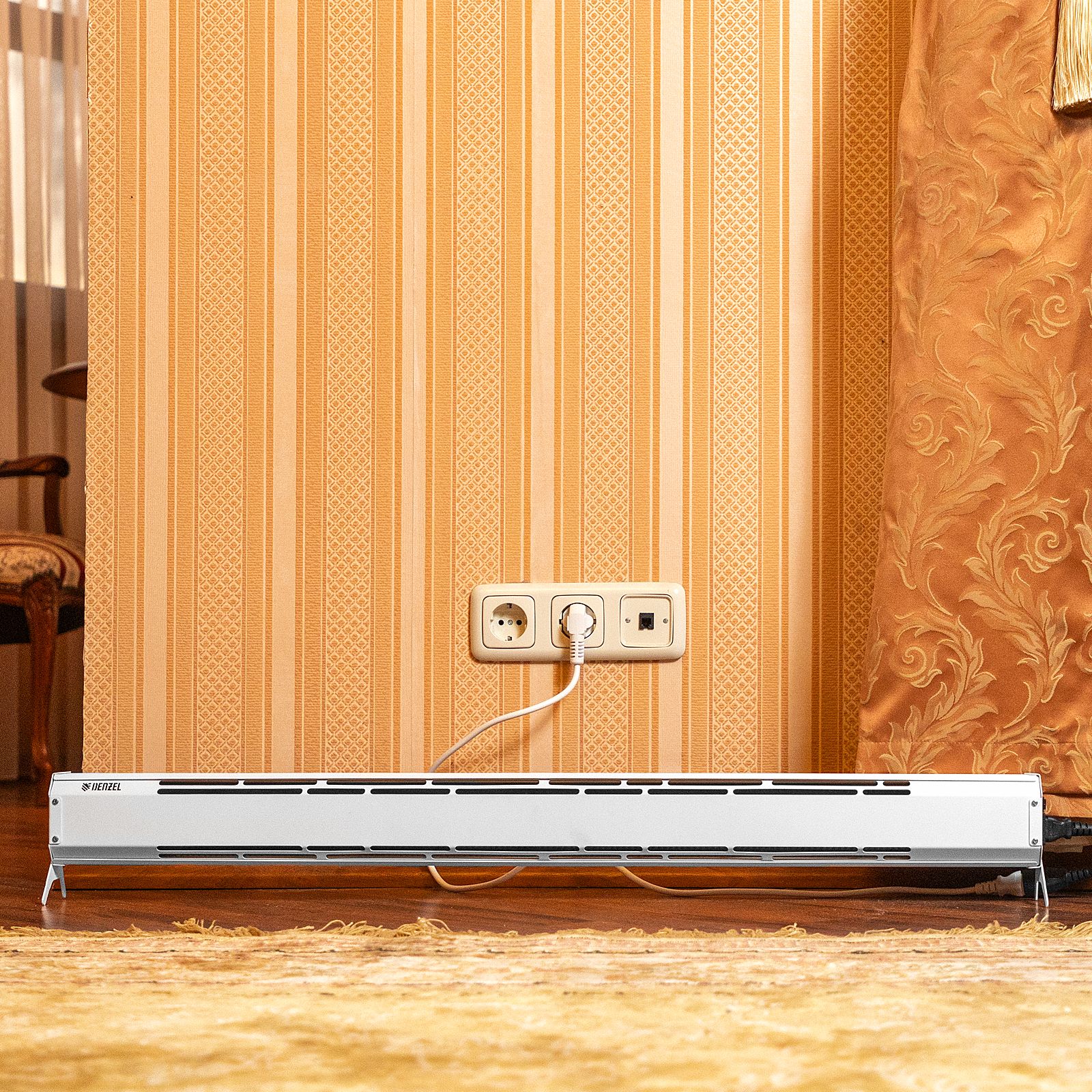 - 3 варианта установки — конвектор можно поставить на пол, закрепить на стене, а также за счет пониженного энергопотребления установить на стены вместо плинтуса.