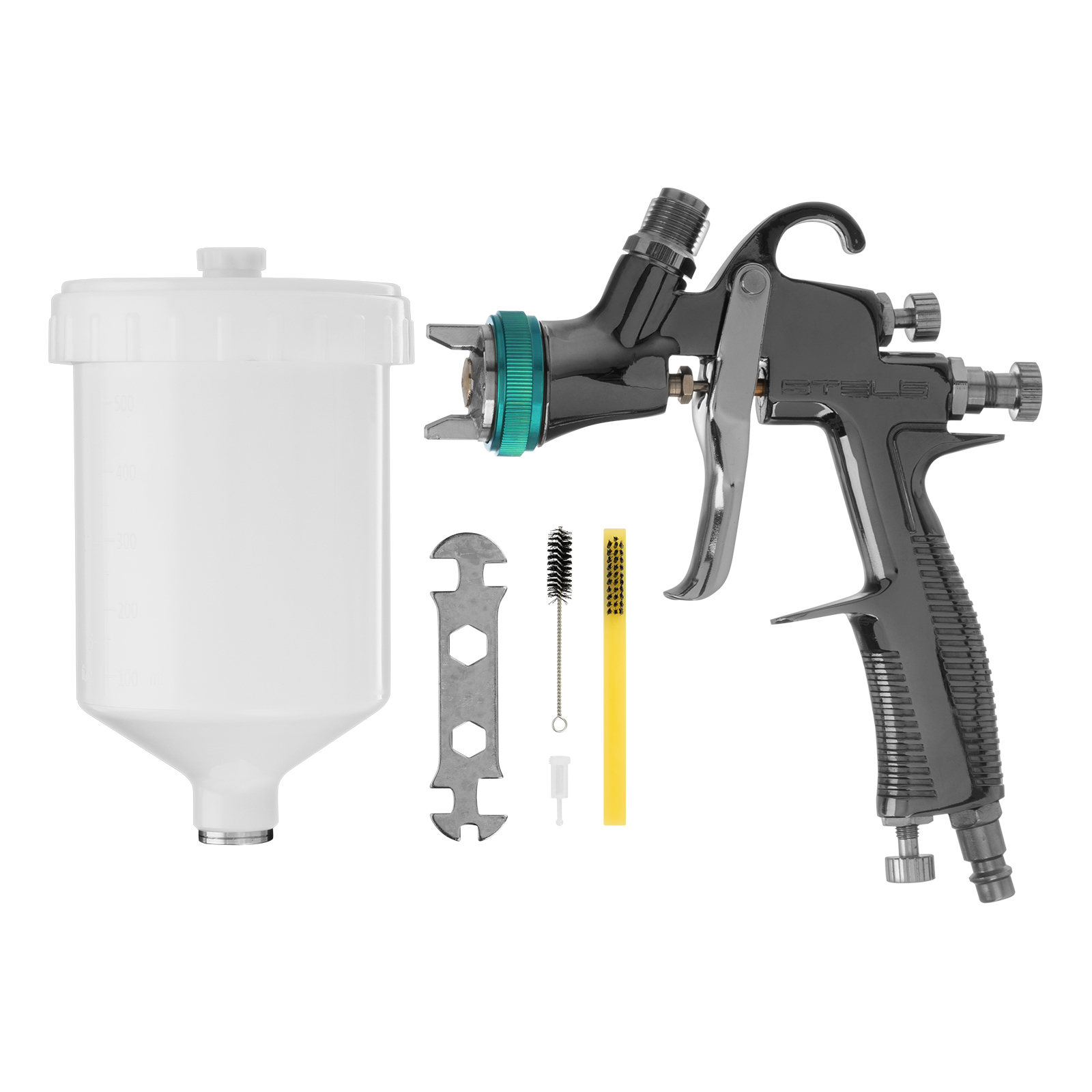 Профессиональный пневматический краскораспылитель гравитационного типа Stels AG 950 LVLP 57367 с соплом диаметром 1,5 мм подходит для проведения окрасочных работ, покрытия керамики глазурью, грунтовки стен, побелки потолков, лакирования дерева. Технология «Низкий объем, низкое давление» (Low Volume Low Pressure) позволяет уменьшить расход окрасочного материала до 140-190 мл/мин и добиться его 80-процентного переноса на обрабатываемую поверхность. Поэтому краскопульт отлично подойдет для применения как в быту, так и на производствах.