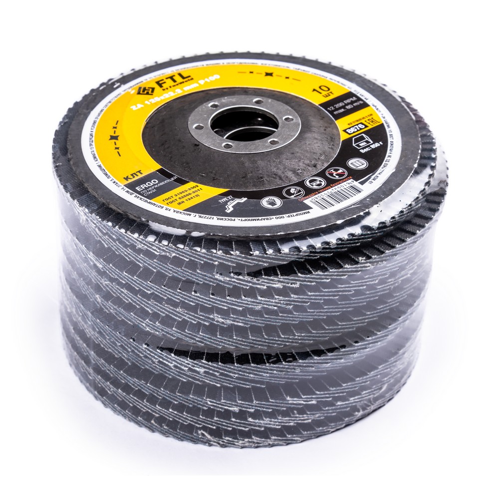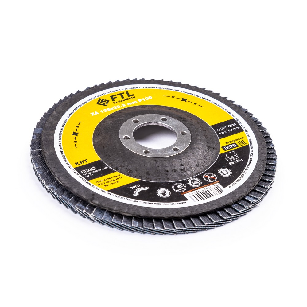 Лепестковый диск для шлифования по нержавеющей стали FTL Ergo 27 125 х 22,2 мм P100 – это расходный материал для ручной угловой шлифовальной машины при работе с изделиями из нержавеющей стали, черных и цветных металлов. Также подходит для обработки твёрдых пород дерева, пластика и полиуретана. Диск предназначен для зачистки и шлифовки сварных швов и кромок стальных заготовок, обработки изделий из нержавеющей стали и полиуретана, шлифовки твёрдых пород дерева. Рабочая поверхность плоского диска ровная и в основном применяется для обработки плоскости и внешних угловых соединений. Оптимальный угол работы для плоского КЛТ – от 0° до 15°. Плоские КЛТ лучше всего подходят для подготовки поверхности и финишной обработки. Удаление материала и финиш происходят за один шаг, что снижает время обработки. Серия ERGO — это универсальный состав из оксида циркония для работы с изделиями из нержавеющей стали. Оксид циркония с лучшей теплопроводностью эффективно отводит тепло из зоны реза, противостоит прижогу и перегреву, сохраняя легирующие свойства нержавеющей стали. Оптимальная формула абразива обеспечивает хороший зацеп с неплохой износостойкостью.ИЗНОСОСТОЙКОСТЬ: Благодаря премиальной формуле режущая и шлифовальная способность абразива снижается в процессе работы значительно медленнее, позволяя выполнить больше работы.ЭФФЕКТИВНАЯ РАБОТА С СИЛЬНЫМ ПРИЖИМОМ: Машинная сборка при производстве исключает ошибки при наклеивании лепестков на основание диска, а плотная набивка обеспечивает более сильный прижим во время работы.САМОЗАТАЧИВАЮЩИЙСЯ АБРАЗИВ: Оксид циркония (циркониевый электрокорунд, цирконий) – это вид абразивного зерна, которое имеет свойство самозатачивания благодаря кристаллической «чешуйчатой» структуре. Зерно циркония в процессе работы постоянно скалывается, из-за чего на поверхности шлифовальной бумаги грани всё время остаются острыми. При этом поверхность заготовки однородна, а зерно скалывается вплоть до момента полного износа, что и обеспечивает высокий ресурс работы инструмента.ВЫСОКОКАЧЕСТВЕННЫЙ ОКСИД ЦИРКОНИЯ: Оптимальное соотношение корунда и самозатачивающихся зёрен оксида циркония позволяют эффективно работать с металлом, деревом и пластиком.ДВОЙНОЕ МЕТАЛЛИЧЕСКОЕ КОЛЬЦО: Двойное металлическое кольцо на диске обеспечивает плотную посадку на фланец УШМ, исключая биения и вибрацию при работе.ПРЕИМУЩЕСТВА:Универсальный (по нержавеющей стали и чёрному металлу)Оксид цирконияМинимальное содержание железа, серы, хлора (не окисляет стали)Тип 27 (куполообразный, с плоской поверхностью)Электростатический метод нанесения абразиваЭффект самозатачиванияВозможность работы с большим прижимом (требуется мощная УШМ)Фибергласс – прочное стекловолоконное основание дискаДвойное металлическое кольцо для плотной посадки на фланец УШМВлагозащитная упаковкаФУНКЦИОНАЛЬНЫЕ ОСОБЕННОСТИ:ГЕРМЕТИЧНОСТЬ УПАКОВКИ: Диски упакованы в специальную термоусадочную герметичную плёнку, которая предохраняет от пыли и влаги при длительном хранении в условиях повышенной влажности, на строительных объектах и крупных промышленных производствах.КОМПЛЕКТАЦИЯ: Круг лепестковый для шлифования по нержавеющей стали FTL Ergo 27 125 х 22,2 мм P100 в термоусадочной плёнке со вкладышем в дополнительном ПЭ пакете – 10 шт.