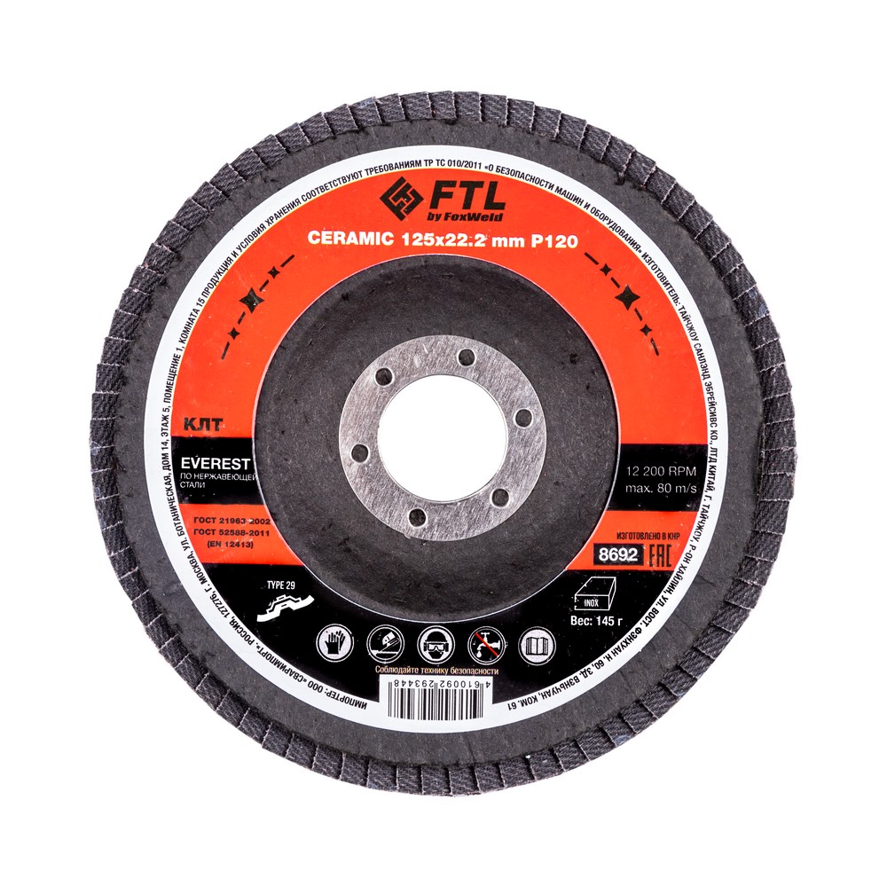 Лепестковый диск для шлифования по нержавеющей стали FTL Everest 29 125 х 22,2 мм P120 – это расходный материал для ручной угловой шлифовальной машины при работе с изделиями из нержавеющей стали, твёрдых сплавов, легированной стали. Диск предназначен для зачистки и шлифовки стальных заготовок, снятия усиления сварного шва, съёма металла, удаления окалины и заусенцев. Коническая форма обеспечивает большое пятно контакта с поверхностью и более агрессивный съём материала. Оптимальный угол работы для конического КЛТ - от 15 до 25 градусов к поверхности. Серия EVEREST — это премиальный инновационный керамический абразив для работы исключительно по изделиям из нержавеющей стали. Электростатический метод нанесения обеспечивает расположение всех абразивных зёрен острыми режущими кромками вверх, перпендикулярно основе. В процессе работы керамические зёрна постоянно сохраняют острую режущую кромку, а отличная теплопроводность керамики наиболее эффективно предотвращает перегрев, что также увеличивает время работы абразива.ИЗНОСОСТОЙКОСТЬ: Благодаря премиальной формуле режущая и шлифовальная способность абразива снижается в процессе работы значительно медленнее, позволяя выполнить больше работы.ЭФФЕКТИВНАЯ РАБОТА С СИЛЬНЫМ ПРИЖИМОМ: Машинная сборка при производстве исключает ошибки при наклеивании лепестков на основание диска, а плотная набивка обеспечивает более сильный прижим во время работы.САМОЗАТАЧИВАЮЩИЙСЯ АБРАЗИВ: Зёрна керамики состоят из ещё более многочисленных и мелких кристаллов по сравнению с оксидом циркония, что обеспечивает ярко выраженный эффект самозатачивания и скалывания в процессе работы. Керамические зёрна постоянно сохраняют острую режущую кромку, а отличная теплопроводность керамики предотвращает перегрев, что также увеличивает время работы абразива. По некоторым исследованиям, керамическое зерно работает в 2 раза агрессивнее, и в 10 раз дольше. чем оксид алюминия.ПРЕМИАЛЬНЫЙ КЕРАМИЧЕСКИЙ АБРАЗИВ: Премиальный компаунд на базе керамического абразива сохраняет остроту режущих кромок до полного износа, не перегревается даже при сильном прижиме и обладает эффектом самозатачивания.ДВОЙНОЕ МЕТАЛЛИЧЕСКОЕ КОЛЬЦО: Двойное металлическое кольцо на диске обеспечивает плотную посадку на фланец УШМ, исключая биения и вибрацию при работе.ПРЕИМУЩЕСТВА:По нержавеющей стали (!)Керамический абразив (лучший по износостойкости и теплопроводности)Минимальное содержание железа, серы, хлораТип 29 (куполообразный, конический)Электростатический метод нанесения абразиваНаилучший эффект самозатачиванияВозможность работы с большим прижимом (требуется мощная УШМ)Двойное металлическое кольцо для плотной посадки на фланец УШМДвойная влагозащитная упаковкаФУНКЦИОНАЛЬНЫЕ ОСОБЕННОСТИ:ГЕРМЕТИЧНОСТЬ УПАКОВКИ: Диски упакованы в специальную термоусадочную герметичную плёнку, которая предохраняет от пыли и влаги при длительном хранении в условиях повышенной влажности, на строительных объектах и крупных промышленных производствах.КОМПЛЕКТАЦИЯ: Круг лепестковый для шлифования по нержавеющей стали FTL Everest 29 125 х 22,2 мм P120 в термоусадочной плёнке со вкладышем в дополнительном ПЭ пакете – 10 шт.