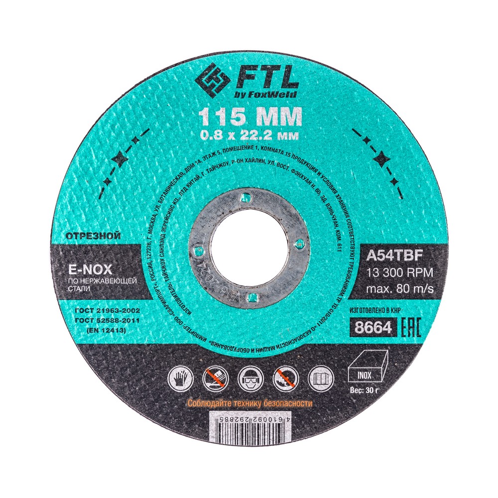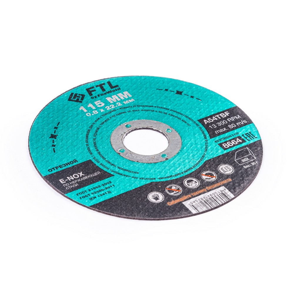 Диск отрезной по нержавеющей стали FTL E-Nox 115 х 0,8 х 22,2 мм A54TBF – это расходный инструмент для ручной угловой шлифовальной машины, предназначенный для резки деталей и конструкций, профиля и листового металла из нержавеющих и легированных сталей. Конструктивно представляет собой плоский диск (тип 41), поверхность которого покрыта слоем абразивных частиц. Посыпка скреплена между собой бакелитовой связкой и армирована одной стекловолоконной сеткой и тканой подложкой. Поставляется во влагозащитной упаковке. Серия E-NOX - новый специализированный абразивный компаунд для работы по изделиям из нержавеющей стали. Оксид циркония с лучшей теплопроводностью эффективно отводит тепло из зоны реза, противостоит прижогу и перегреву, сохраняя легирующие свойства нержавеющей стали. Минимальные значения железа, серы и хлора в составе абразива гарантируют защиту от окисления. Не рекомендуется к работе с изделиями из чёрных металлов из-за недостаточной износостойкости (увеличенного расхода материала диска при работе).УВЕЛИЧЕННАЯ СКОРОСТЬ РЕЗА: Компаунд на базе оксида циркония не перегревает, не окисляет, не искрит, не дымит, при этом демонстрируя высокий результат по количеству резов и скорости работы по сравнению с составами абразива общего значения.ВЫСОКОКАЧЕСТВЕННЫЙ ОКСИД ЦИРКОНИЯ: Серия E-NOX – это новый, узко специализированный состав для работы по нержавеющей стали, титану и меди. Благодаря присутствию оксида циркония в составе компаунда, круги не перегревают материалы, сберегая заготовки от побежалостей, посинений, окислений, при этом демонстрируя высокие результаты по количеству резов и скорости работы. Комфортный и мягкий рез по нержавейке.УНИКАЛЬНЫЙ СОСТАВ: Технология производства включает в себя эксклюзивный рецепт абразива и смол: применение только твёрдых составов класса ВТ1, ВТ2, армирование сеткой из стекловолокна. Высокая твёрдость связывающей смолы позволяет сделать значительно большее количество резов по сравнению с кругами с обычным абразивом.МЕТАЛЛИЧЕСКОЕ КОЛЬЦО: Металлическое кольцо на диске обеспечивает плотную посадку на фланец УШМ, исключая биения и вибрацию при работе.ГЕРМЕТИЧНОСТЬ УПАКОВКИ: Диски упакованы в специальную термоусадочную герметичную плёнку, которая предохраняет от пыли и влаги при длительном хранении в условиях повышенной влажности, на строительных объектах и крупных промышленных производствах.ПРЕИМУЩЕСТВА:По нержавеющей и легированной сталиОксид циркония (не перегревает материалы)Минимальное содержание железа, серы, хлора (не окисляет материалы)Тип 41 (плоский)Увеличенный срок службыФибергласс – прочное стекловолоконное основание дискаМеталлическое кольцо для плотной посадки на фланец УШМВлагозащитная упаковкаКОМПЛЕКТАЦИЯ: Отрезной круг по чёрному металлу в термоусадочной плёнке со вкладышем – 10 шт.