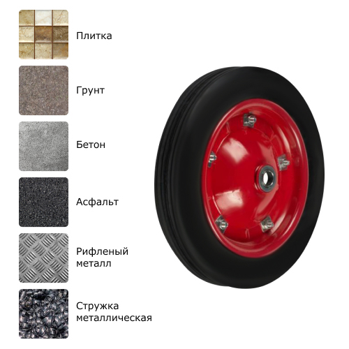 Грузоподъемность данного литого резинового колеса составляет 170 кг, диаметр — 310 мм. Модель не требует подкачки и дополнительного обслуживания. Чаще всего устанавливается на строительные тачки, которые используются на поверхностях, где есть высокая вероятность повреждения и прокола.