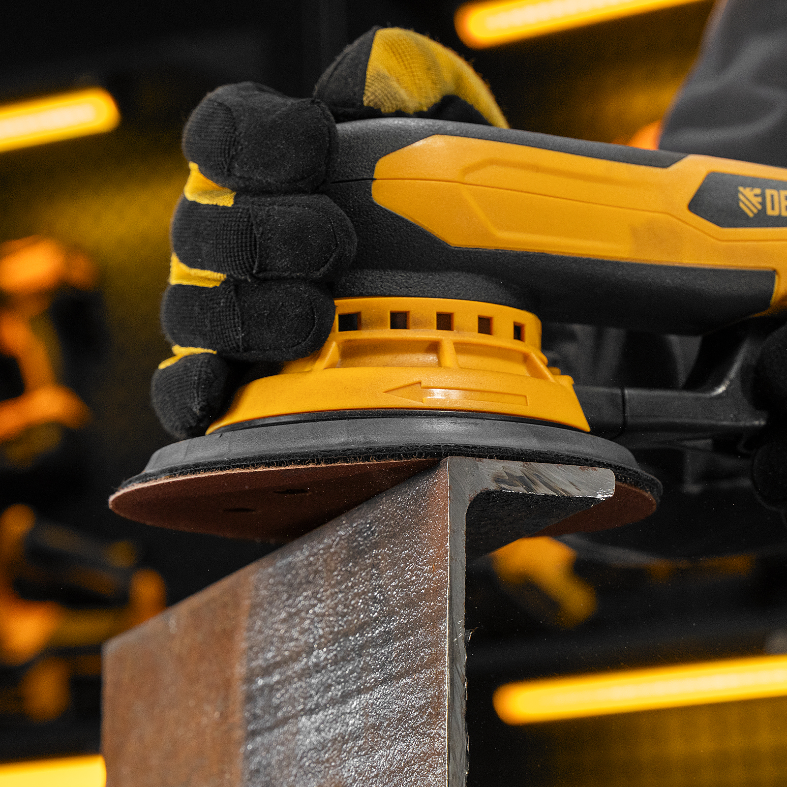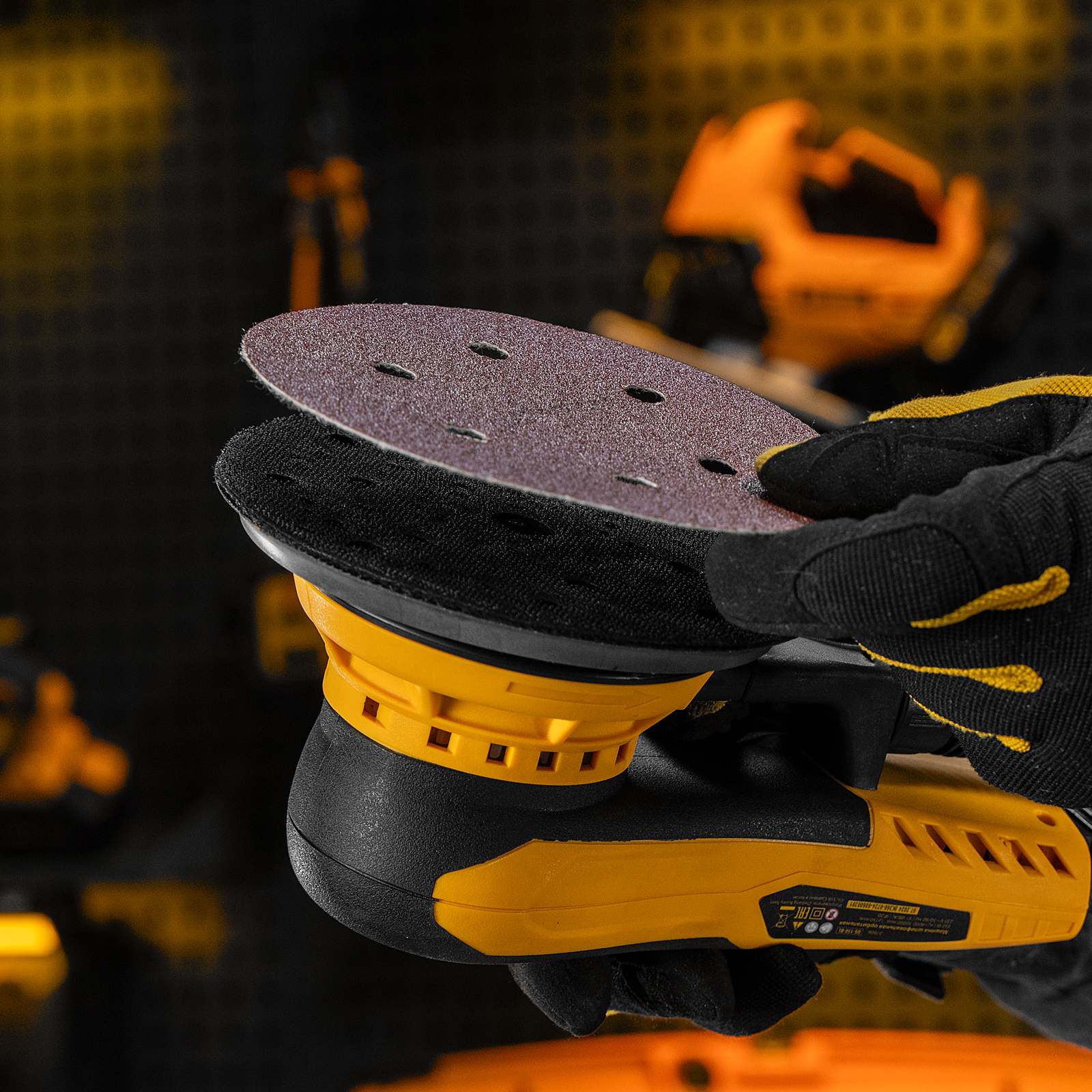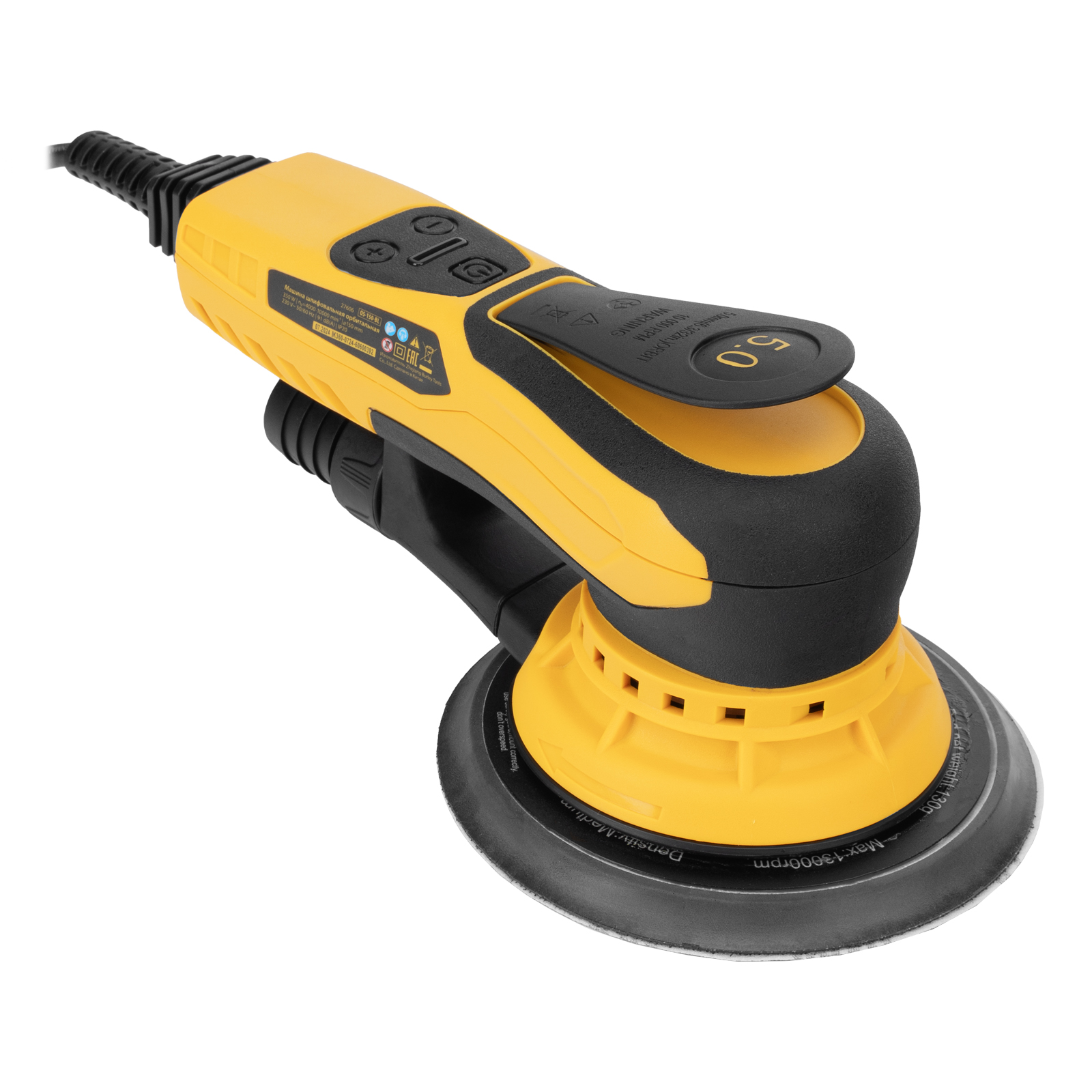 Эксцентриковая шлифмашина совместима со шлифовальными кругами диаметром 150 мм. Во время работы подошва совершает вращательные движения в комбинации с колебательными, что обеспечивает повышенную производительность и успешное решение поставленных задач.