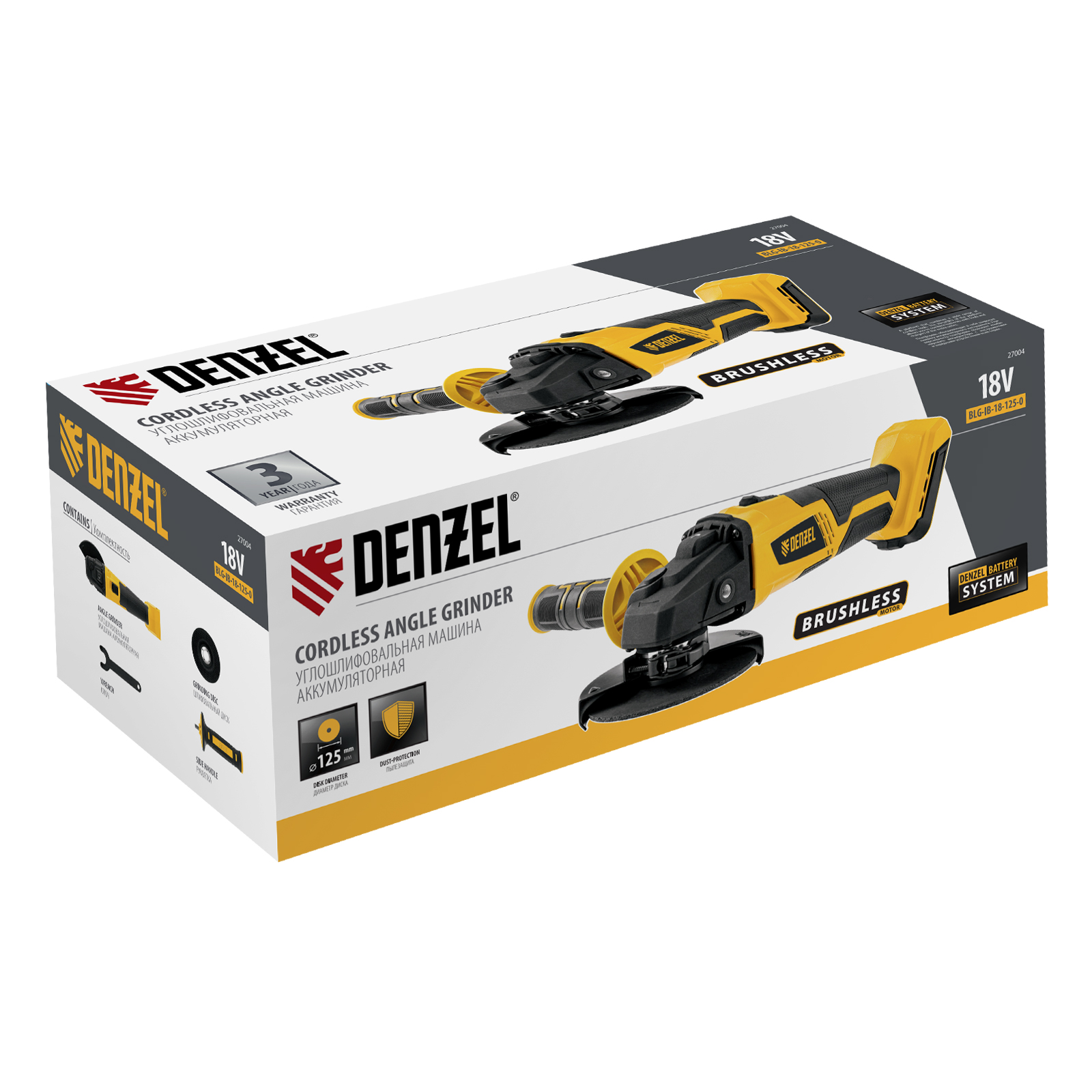- Универсальность — к УШМ подходит аккумулятор 4Ач Li-ion, совместимый с любым инструментом 18V Denzel battery system серии IB (в комплект поставки не входит).