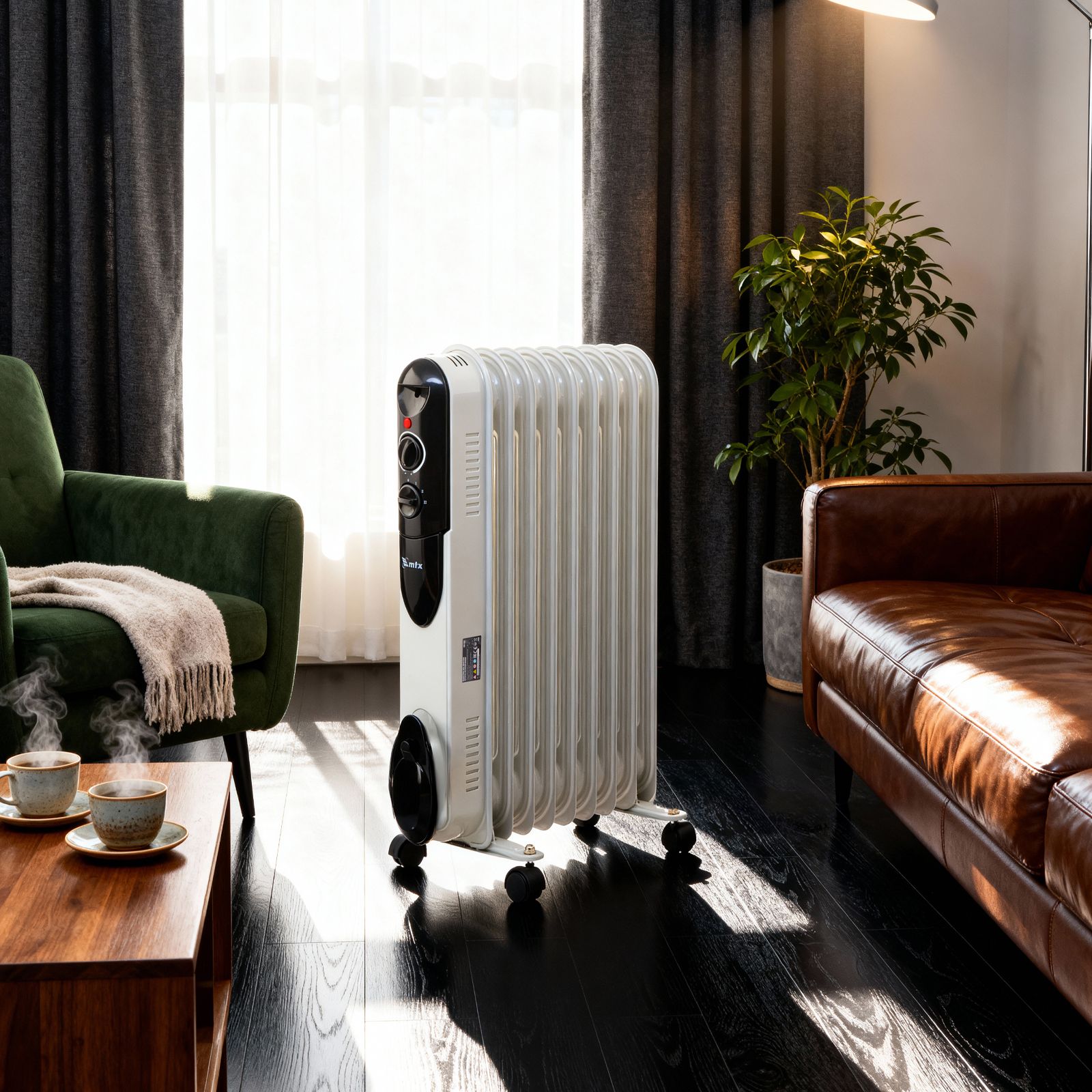 - Легкое перемещение — обогреватель оснащен 4 колесами, а на корпусе имеется удобная ручка.