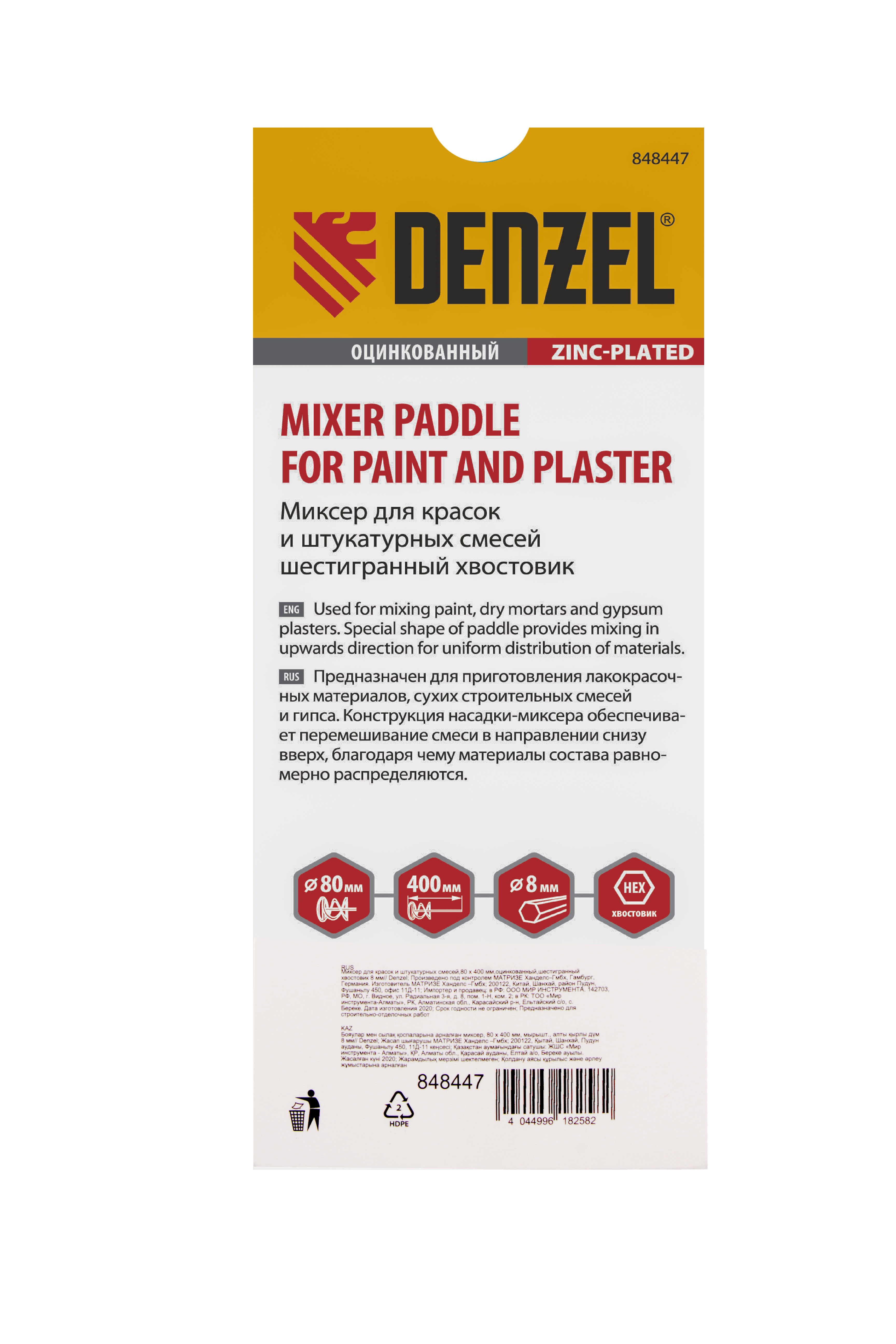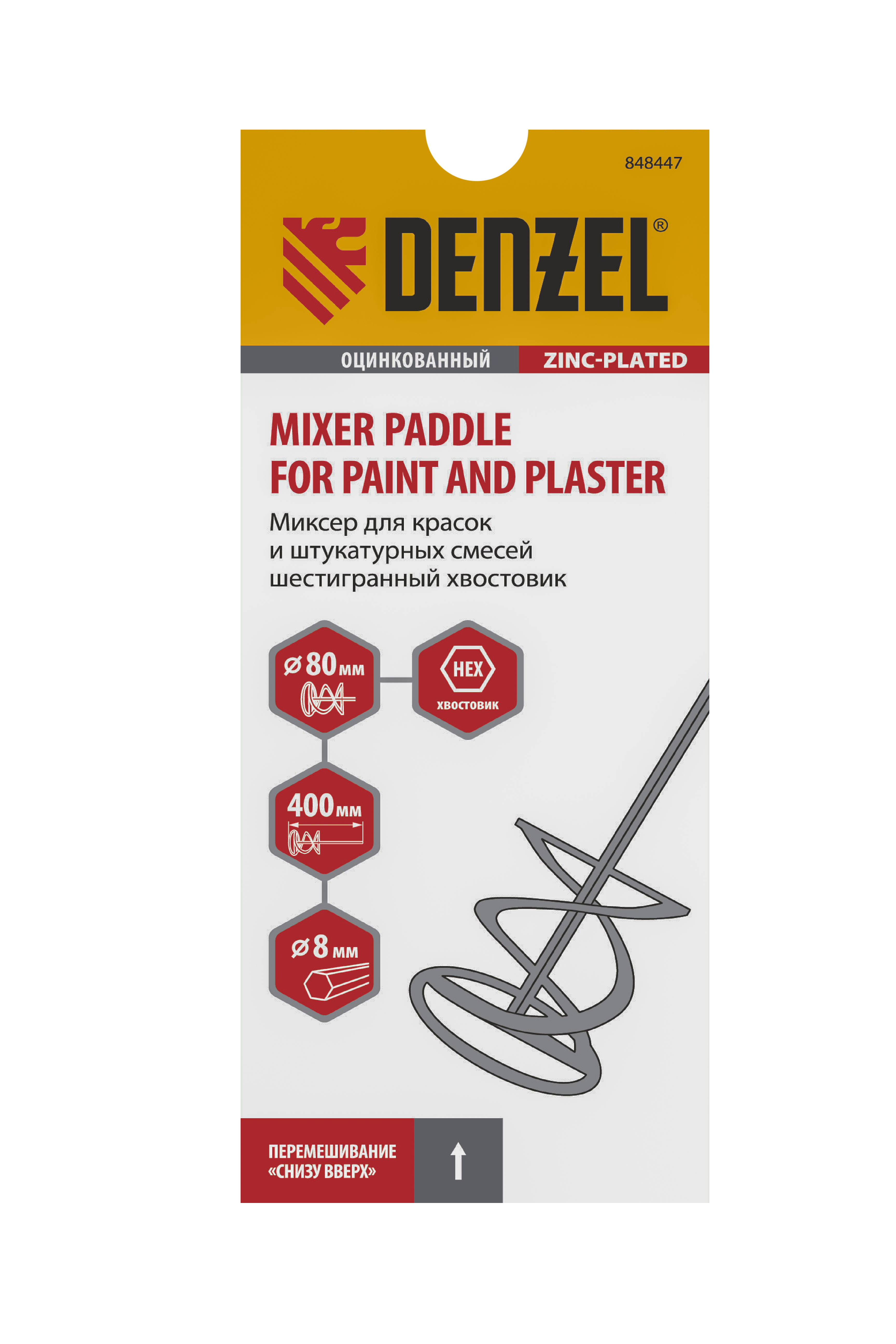 Миксер для красок и штукатурных смесей, 80 х 400 мм, оцинкованный, шестигранный хвостовик 8 мм Denzel в Воронеже