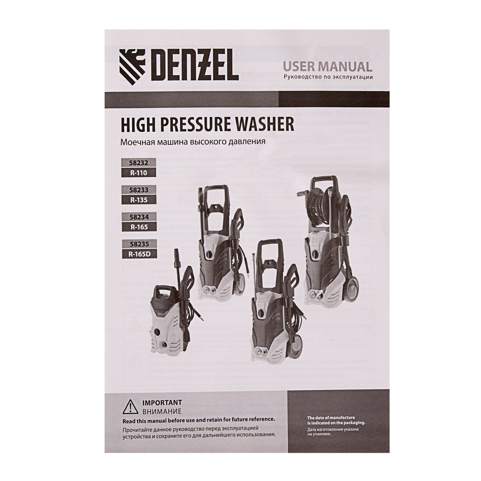 Моечная машина высокого давления R-165, 2200 Вт, 165 бар, 7 л/мин, колесная Denzel в Воронеже