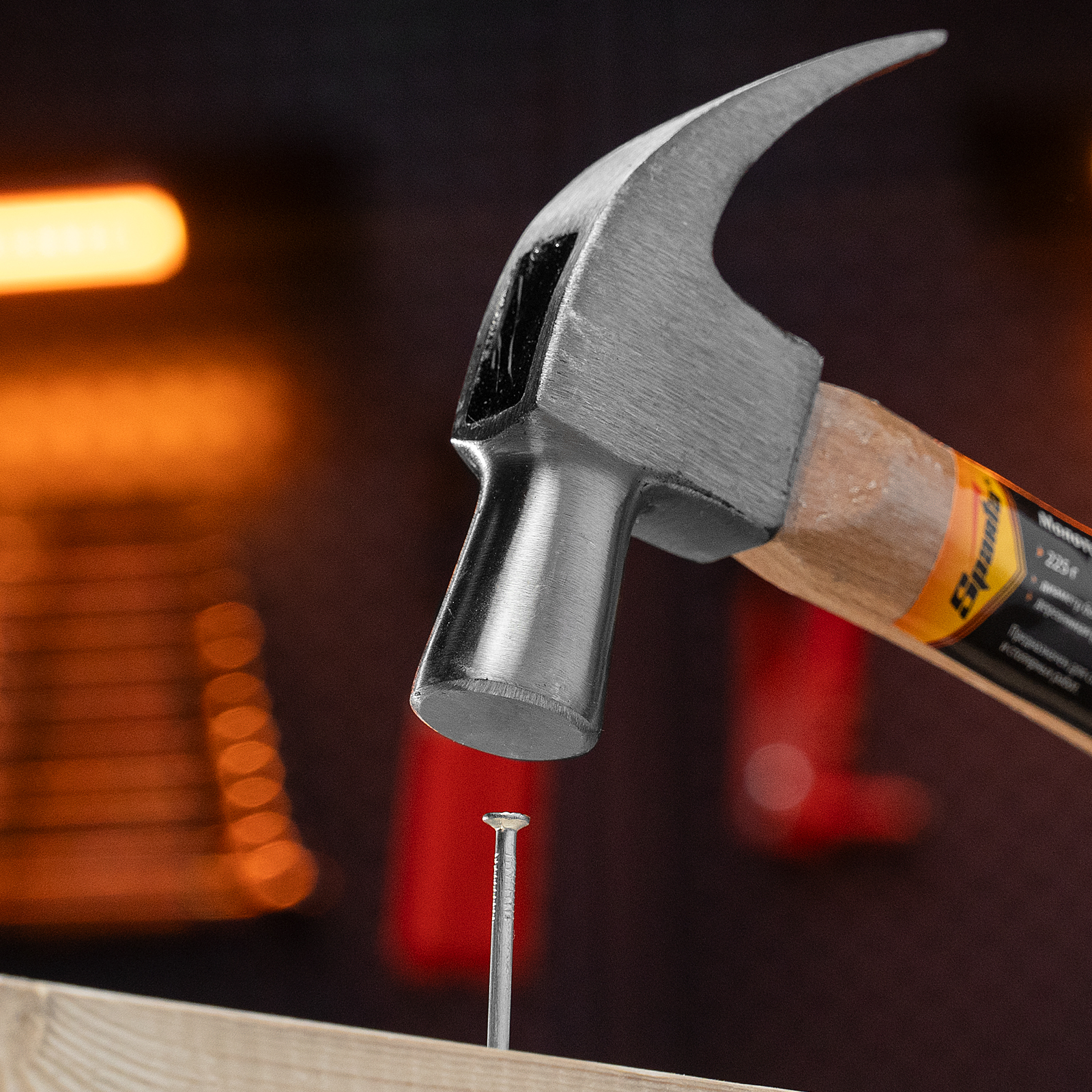 - Продуманная конструкция — увеличенная «юбка» в месте входа рукояти в головку защищает рукоятку от повреждений в случае промаха по гвоздю.