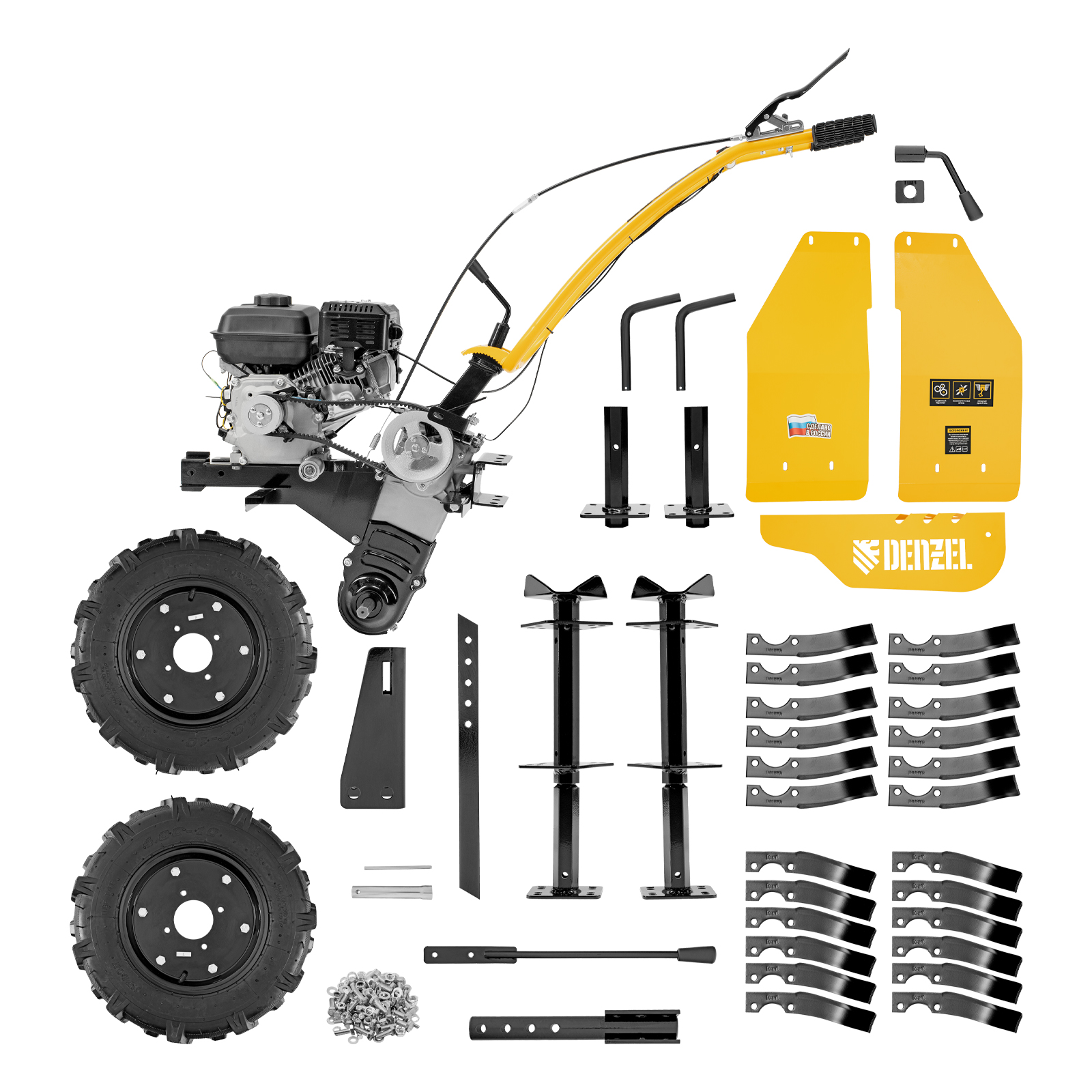 Мотоблок - 1 штКолесо - 2 шт, ось крепления колеса - 2 штКомплект фрез - 1 шт, комплект осей для крепления фрез - 1 штСошник - 1 шт, сцепка сошника - 1 штПалец крепления кронштейна сошника - 1 штПередний кронштейн для навесного оборудования - 1 штКрыло защитное - 2 штСоединительные планки крыльев: передняя - 1 шт, задняя - 1 штРычаг переключения передач - 1 штФиксатор руля управления - 1 штКомплект крепежа - 1 штРуководство по эксплуатации с гарантийным талоном - 1 шт |