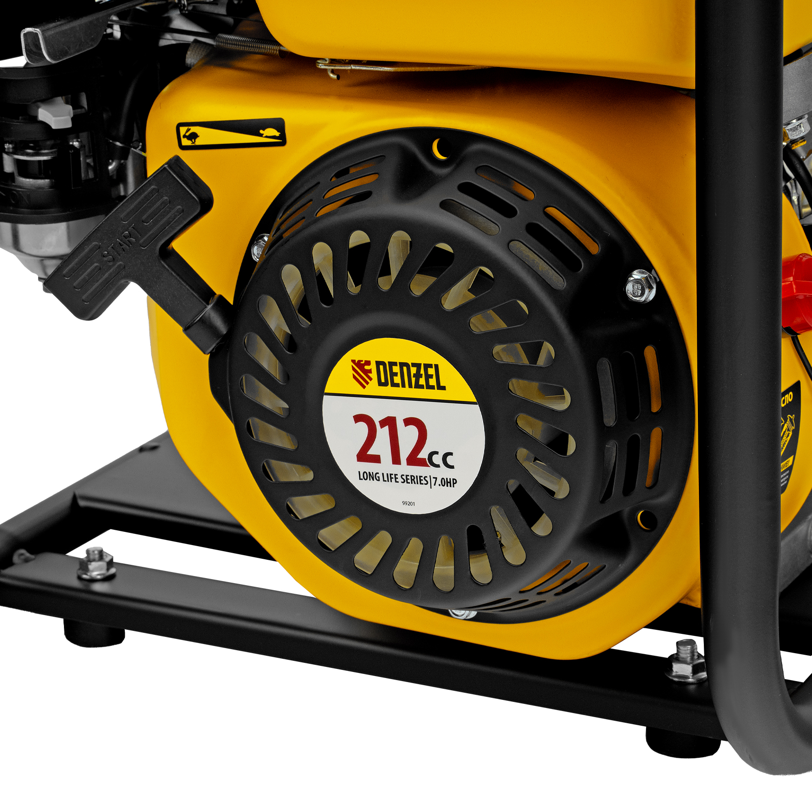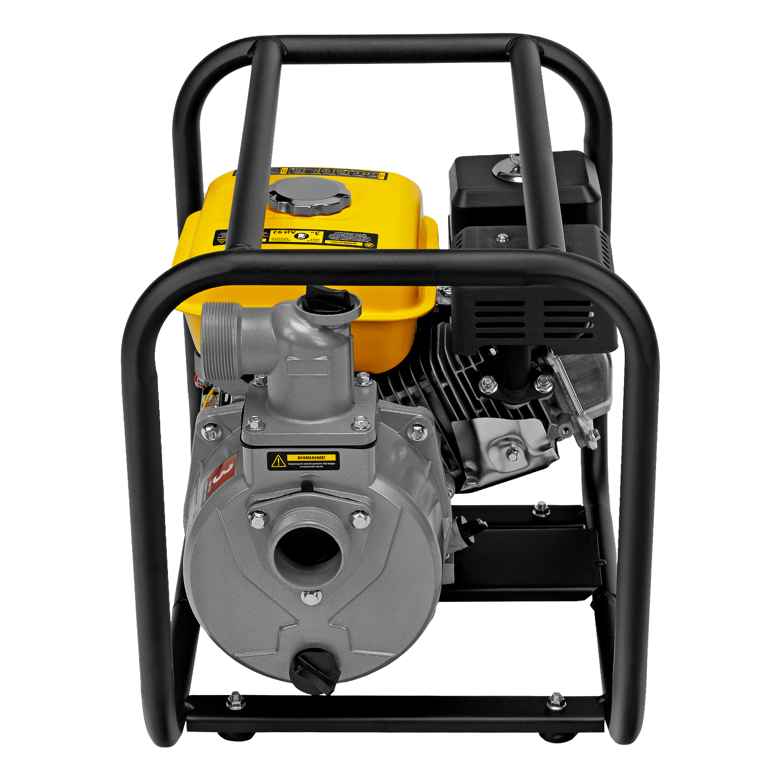 - Прочная конструкция — усиленная рама с широким основанием защищает мотопомпу от повреждений и обеспечивает устойчивость даже на неровной поверхности.