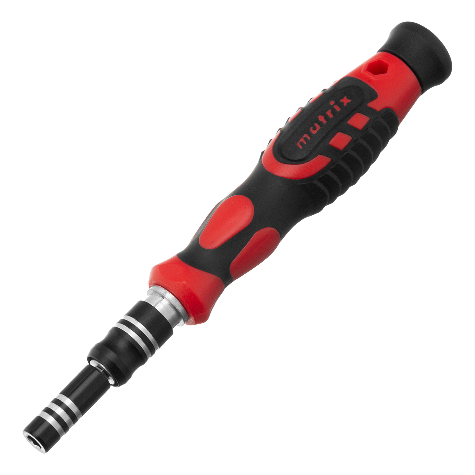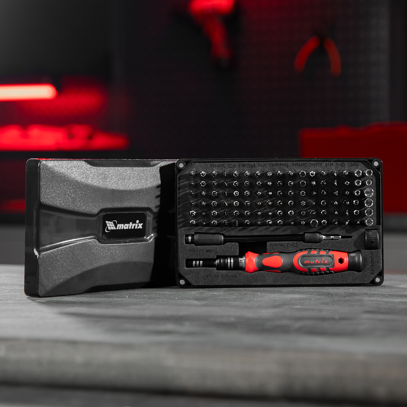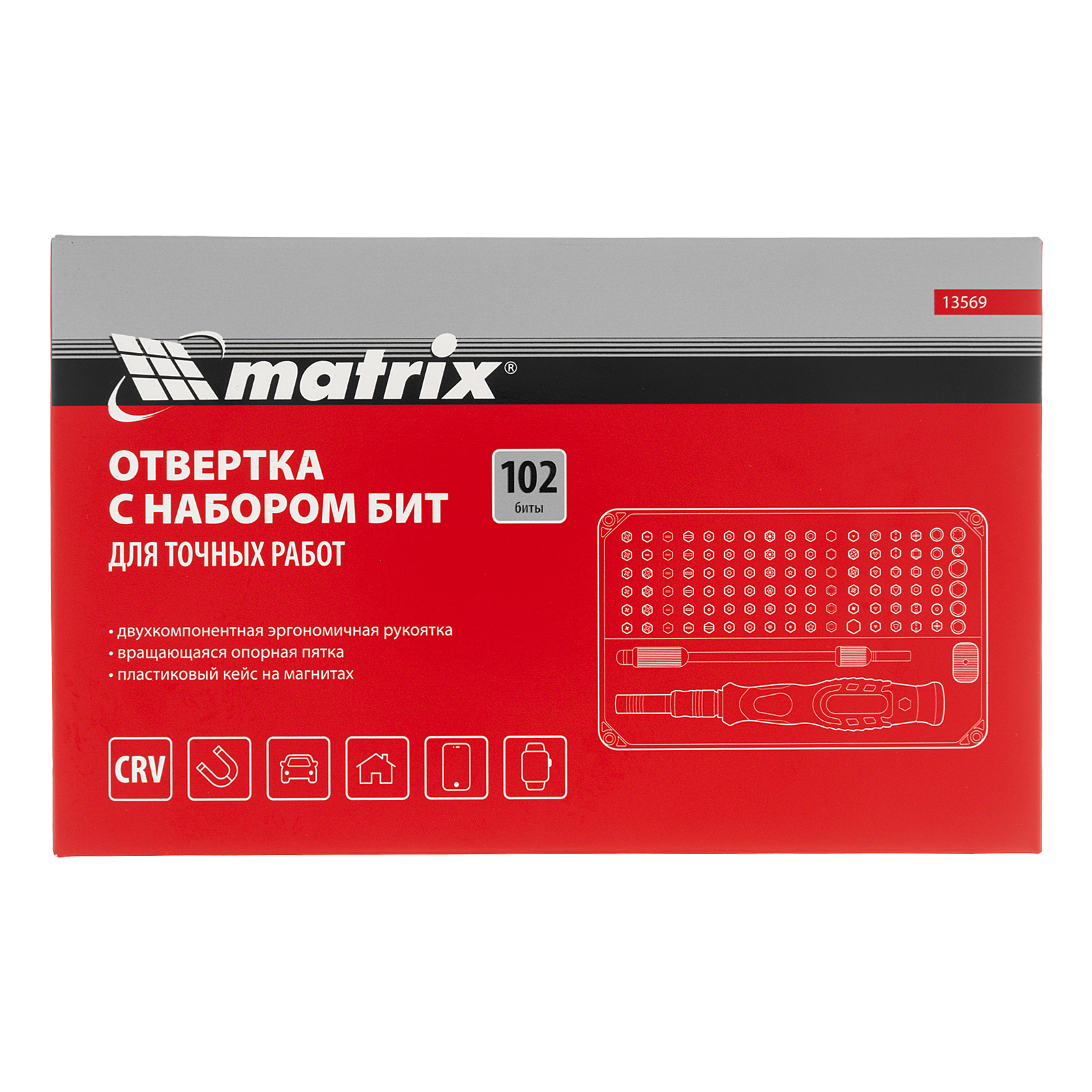 Набор для точных работ Matrix 13569 включает в себя 93 биты, 9 торцевых головок, телескопический и гибкий удлинители, намагничиватель-размагничиватель бит, отвертку и пинцет с защитным колпачком. С его помощью можно отремонтировать очки, игрушки, портативную и бытовую технику и т.д. Выдвижной стержень, гибкий удлинитель и пинцет позволяют работать с мелкими деталями в углублениях и труднодоступных местах.