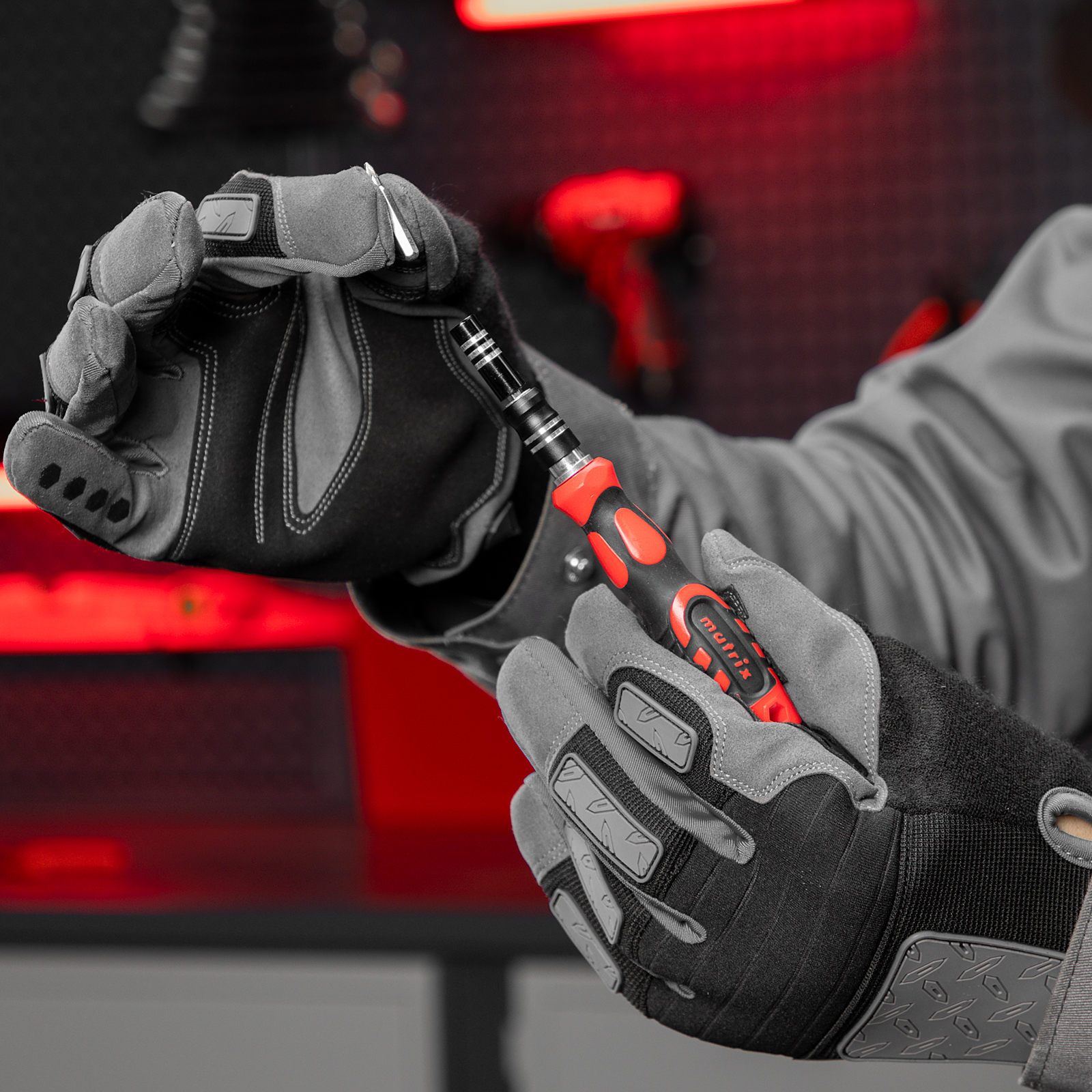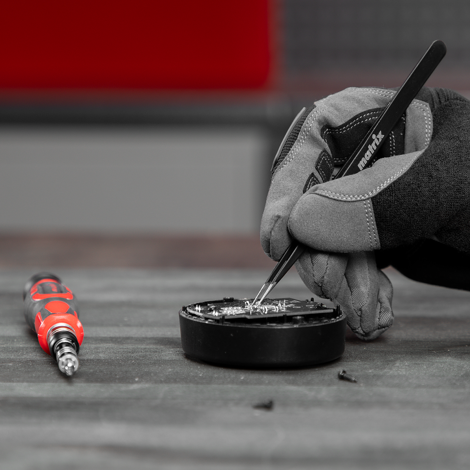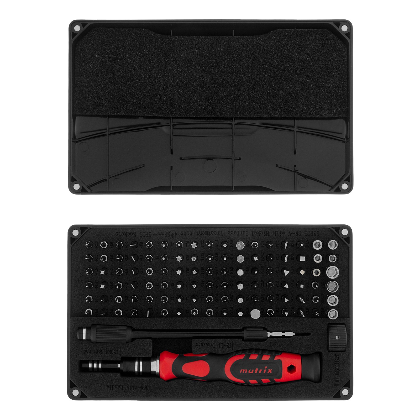 Набор для точных работ Matrix 13569 включает в себя 93 биты, 9 торцевых головок, телескопический и гибкий удлинители, намагничиватель-размагничиватель бит, отвертку и пинцет с защитным колпачком. С его помощью можно отремонтировать очки, игрушки, портативную и бытовую технику и т.д. Выдвижной стержень, гибкий удлинитель и пинцет позволяют работать с мелкими деталями в углублениях и труднодоступных местах.