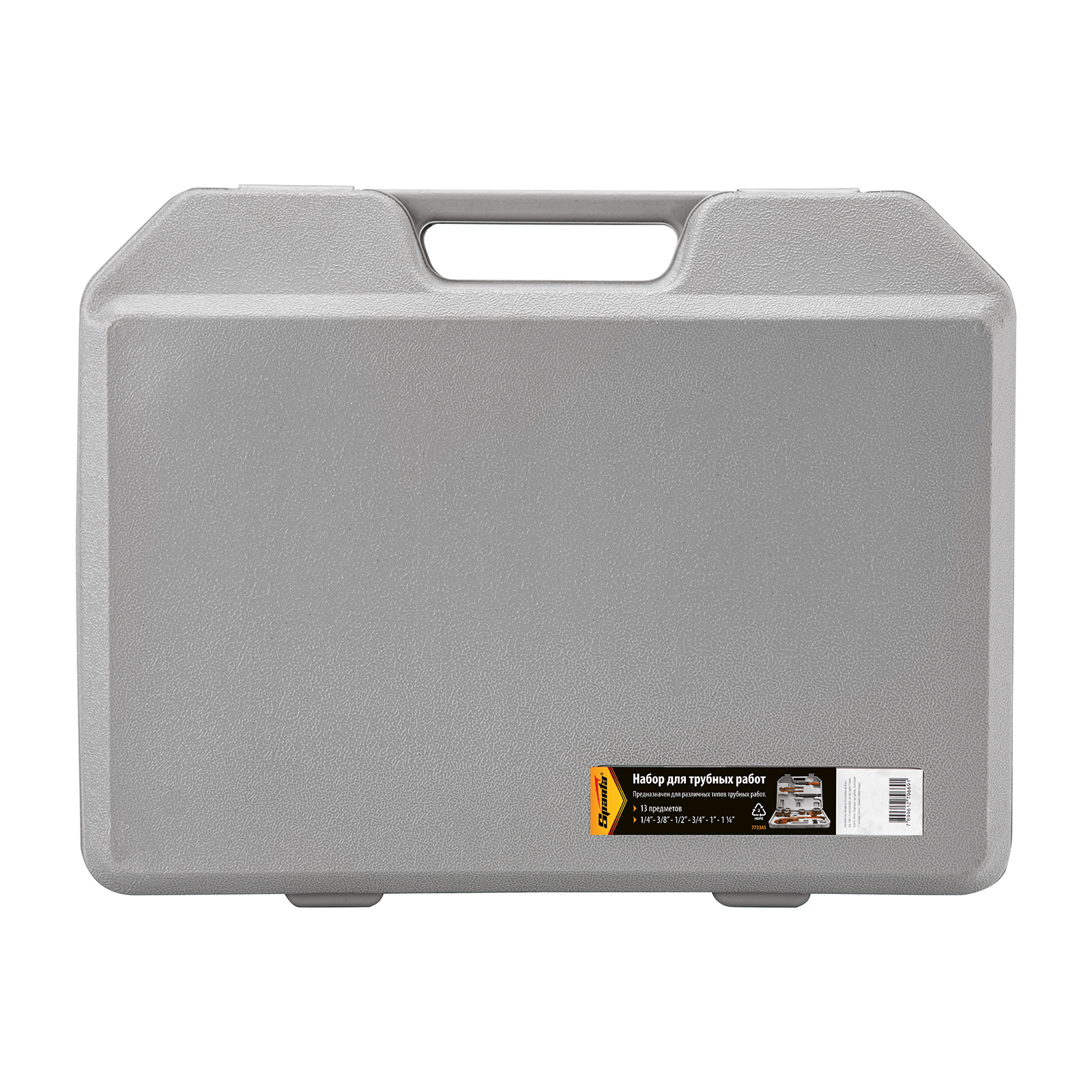 Набор для трубных работ Sparta 773345, состоящий из 13 предметов, пригодится частному мастеру. С его помощью можно нарезать резьбу на трубах и болтах при проведении ремонта в системах водопровода, отопления и газа. Клупп с трещоточным механизмом повышает скорость нарезки, а также облегчает работу в труднодоступных местах.