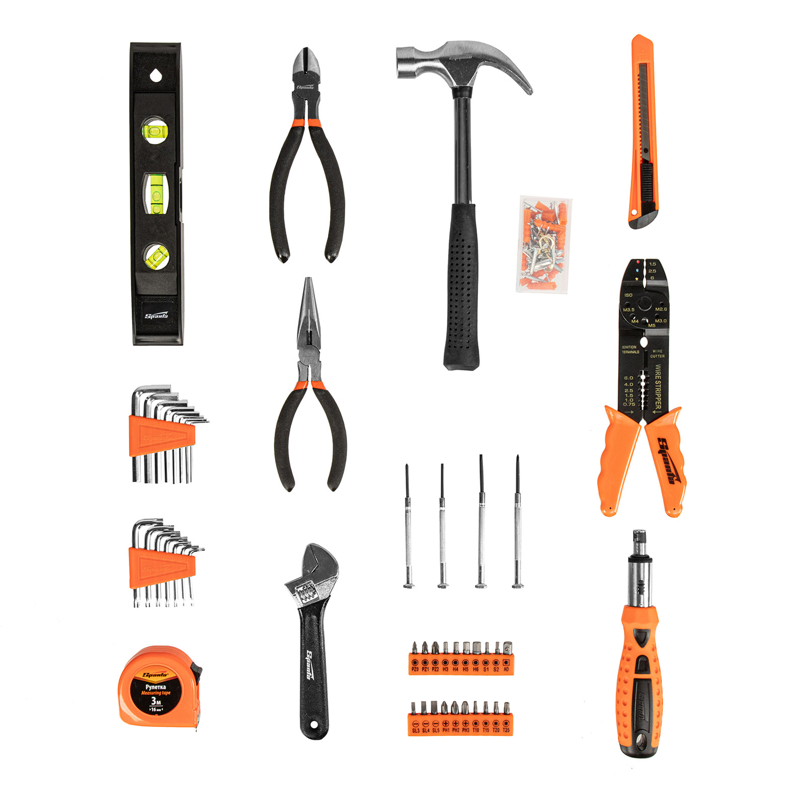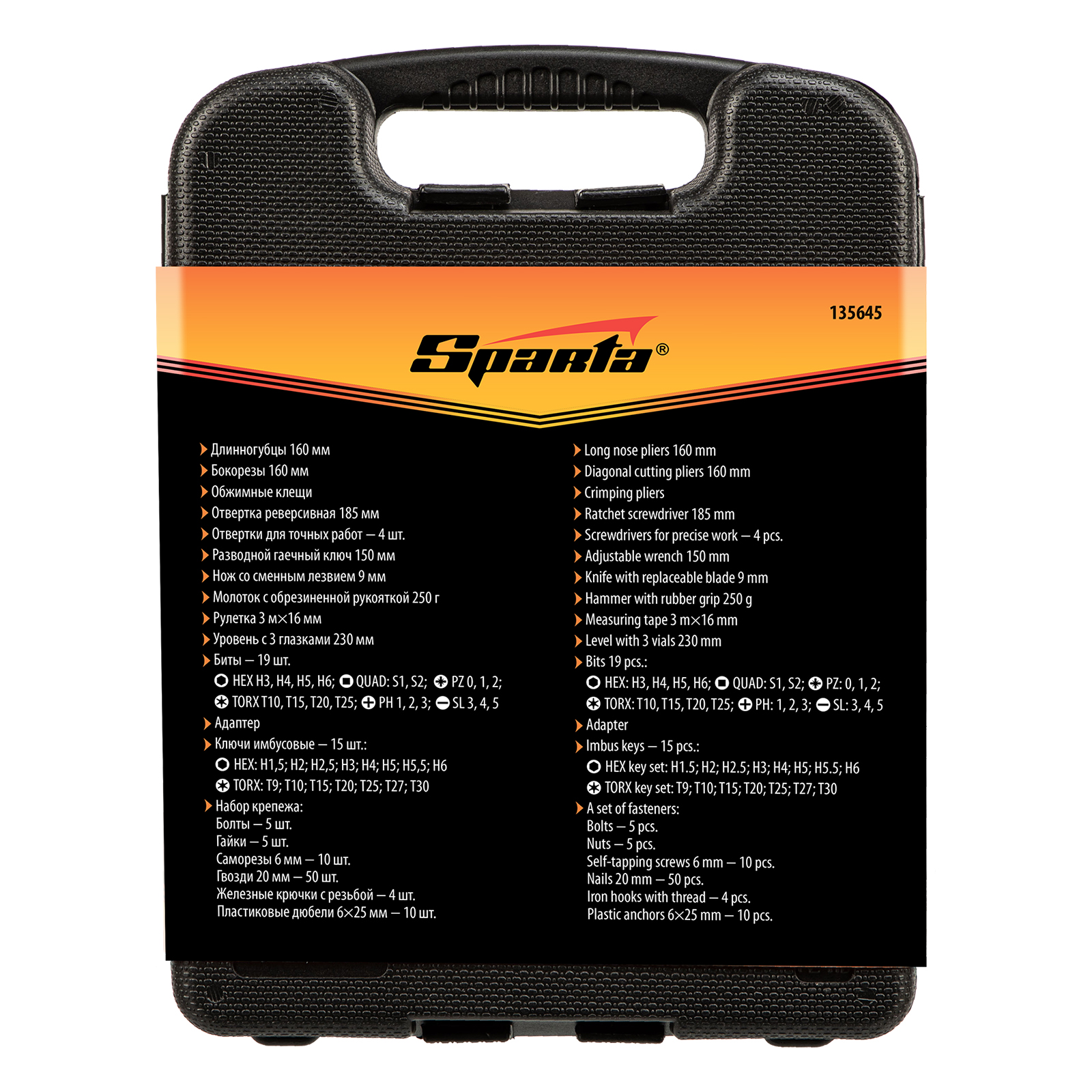 Набор инструментов Sparta 135645 включает в себя 132 предмета для бытового применения: обжимные клещи, отвертки, в том числе для точных работ, молоток-гвоздодер, бокорезы, строительный уровень, разводной и имбусовые ключи, биты-вставки с адаптером, длинногубцы, рулетку, канцелярский нож, а также набор крепежа. Инструменты оптимально подходят для выполнения слесарно-монтажных работ дома или на даче.