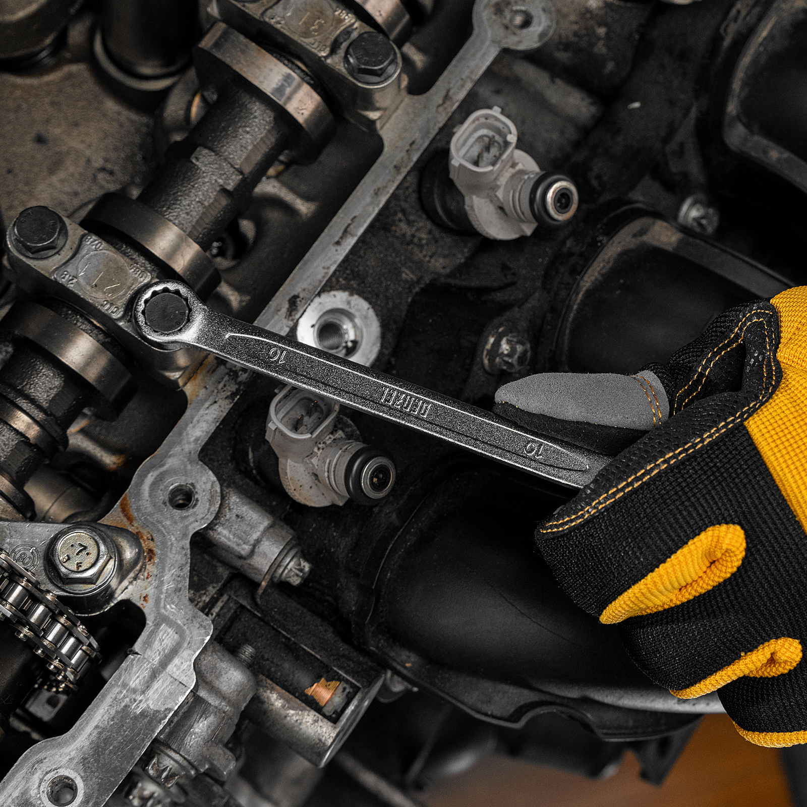 - Удобная работа в труднодоступных местах — 90-зубый храповой механизм ключа-трещотки обеспечивает плавный ход, угол поворота составляет всего 4°.