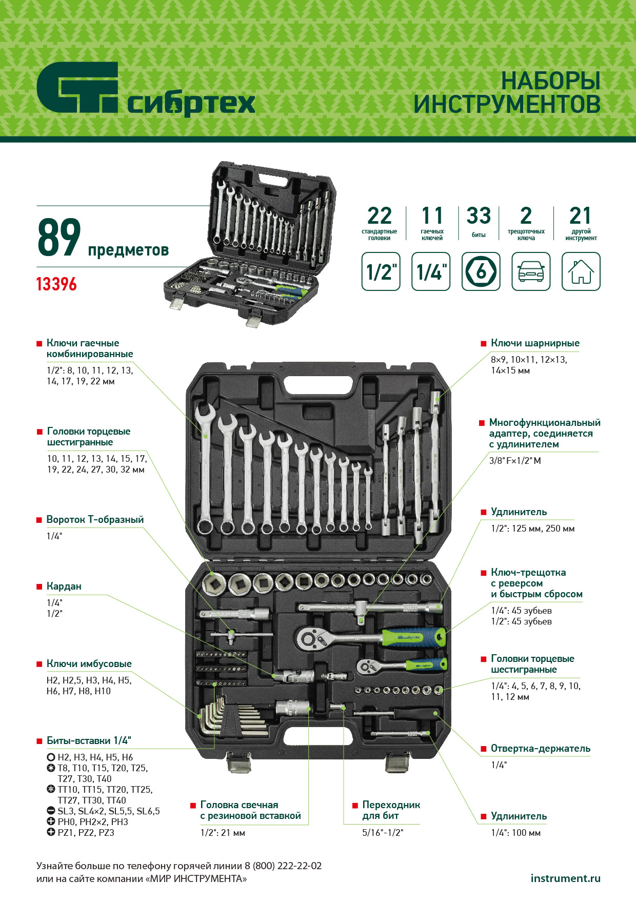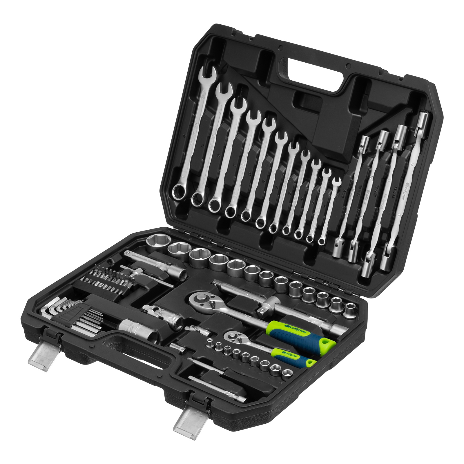 Набор инструментов Сибртех 13396 упакован в пластиковый кейс и состоит из 89 предметов с присоединительным размером 1/2" и 1/4", предназначенных для монтажа и демонтажа резьбового крепежа с разными типами шлицев. В комплект поставки входят карданы, удлинители и шарнирные ключи, облегчающие работу в труднодоступных местах. Набор используется для ремонта автомобилей, а также полезен в быту.
